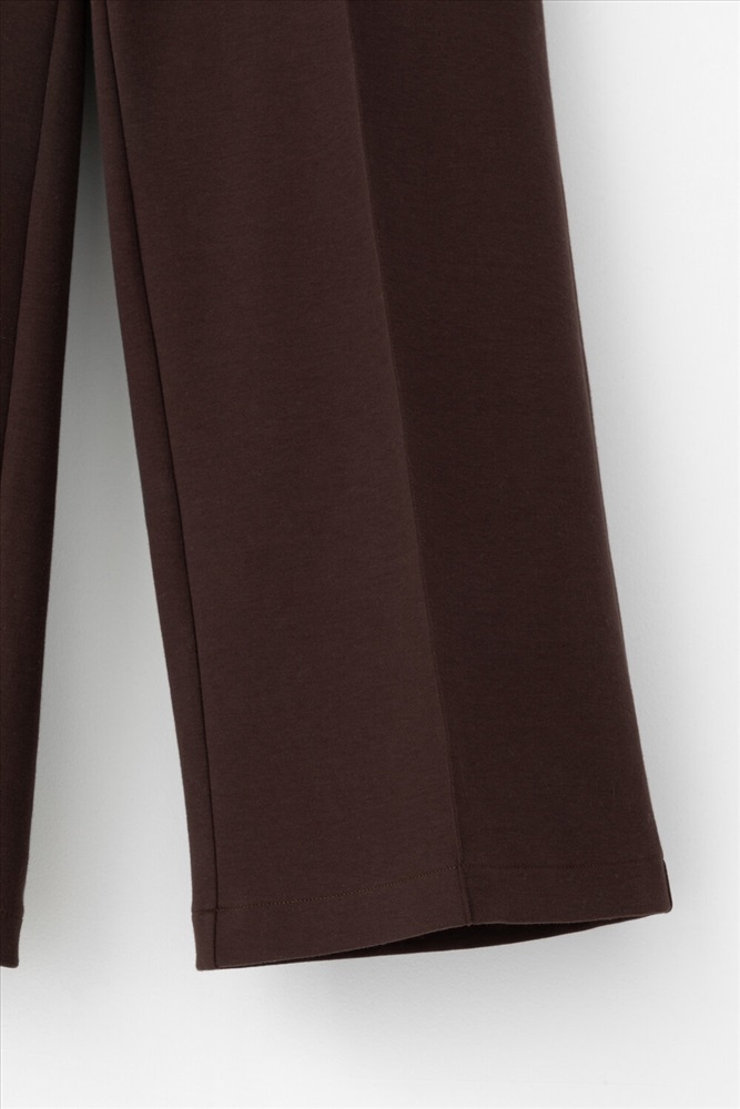 Свободные женские брюки со стрелкой и боковыми карманами из плотного гладкого трикотажа интерлок. Застежка на кнопку. Низ обработан плоскими швами.