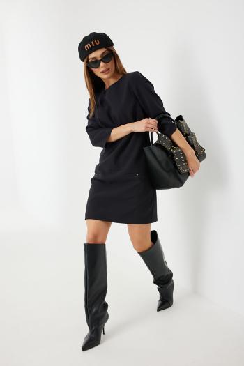 Платье женское из костюмно-плательной ткани на подкладке. Рукав укороченный, одношовный. По спинке средний шов и талевые вытачки, что создает полуприлегающий силуэт. По переду горизонтальный подрез чуть ниже линии талии. На нижней части переда имитация кармана- листочка с золотистой хальнитеной.