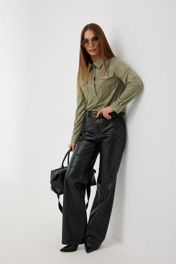 Брюки прямого силуэта из экокожи. Застёжка по переду на молнию и кнопку на поясе. Пояс
