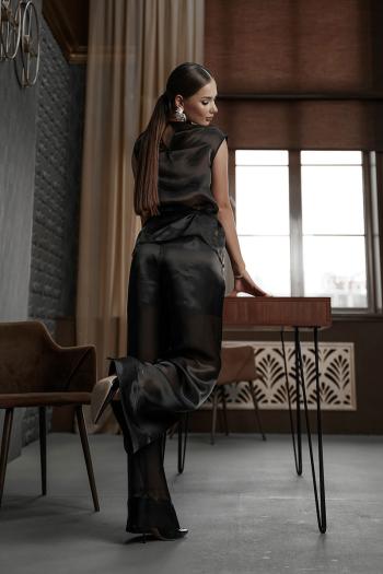 Брюки из нарядной полупрозрачной ткани «органза», прямые, широкие. Средняя посадка, пояс притачной, застежка спереди на молнию и декоративную пуговицу. Брюки с глубокими складками по переду. Брюки на подкладке в виде шорт.