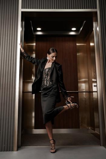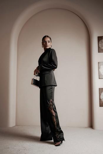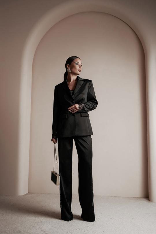Жакет из атласной ткани, полуприлегающего силуэта, с центральной застежкой на три петли и декоративные пуговицы. Перед с талиевой вытачкой, отрезным бочком, прорезным карманом с клапаном. Спинка с отрезным бочком, средний шов заканчивается открытой шлицей. По низу длинного рукава вышивка с кружевом. Воротник пиджачный с отрезной стойкой. Жакет на подкладке с плечевыми накладками.