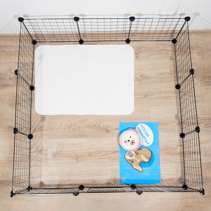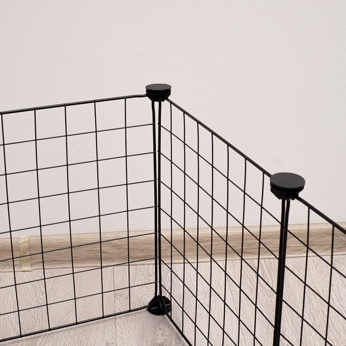 Вольер (клетка) сделан из негнущихся металлических секций, его можно быстро собрать и разобрать на открытом воздухе или в квартире без каких-либо дополнительных инструментов. Съемная конструкция складных перегородок разборного домика позволяет формировать квадратную, прямоугольную или любую неправильную форму.