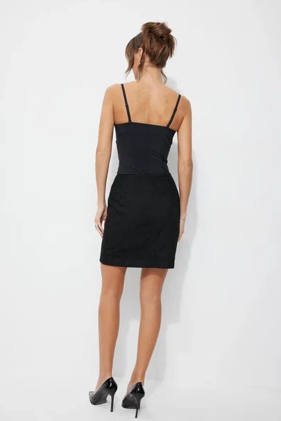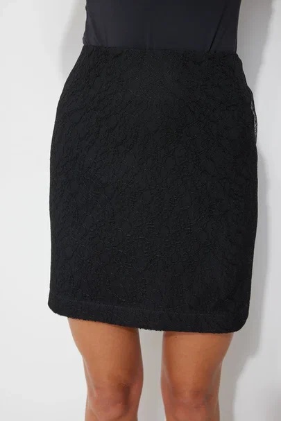 Нарядная мини-юбка. Верхний слой юбки выполнен из кружевной ткани. Нижний слой юбки - плотная струящаяся ткань. С потайной молнией в среднем шве заднего полотнища.