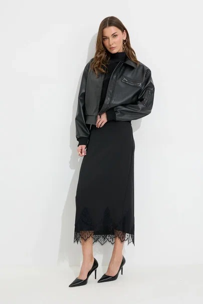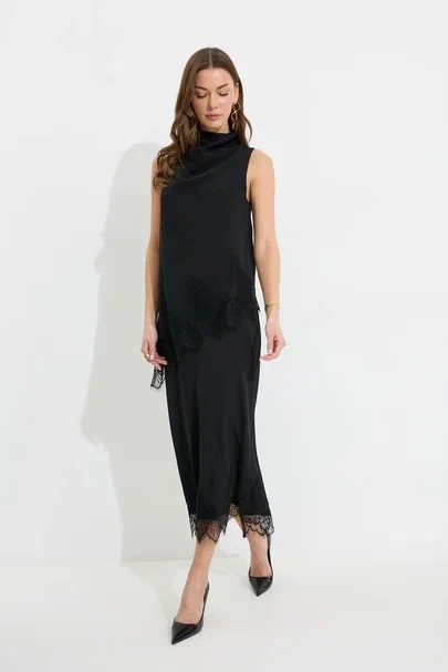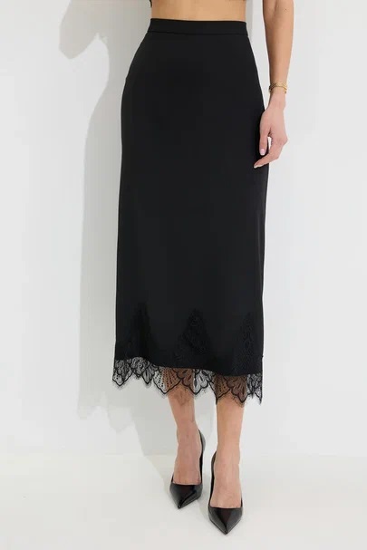 Юбка прямого силуэта из струящейся ткани. По верху юбки притачной пояс с резинкой по задней половинке пояса от бокового шва до вытачки. В центральном шве потайная молния, по низу разрез. По низу юбки декоративная тесьма( кружево). Обращаем ваше внимание, что фурнитура может отличаться от фото.
