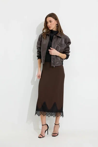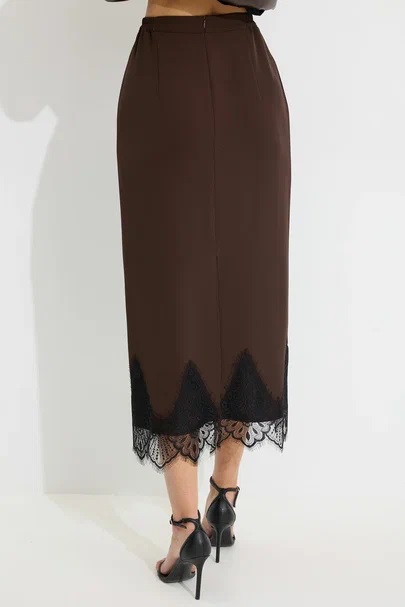 Юбка прямого силуэта из струящейся ткани. По верху юбки притачной пояс с резинкой по задней половинке пояса от бокового шва до вытачки. В центральном шве потайная молния, по низу разрез. По низу юбки декоративная тесьма( кружево). Обращаем ваше внимание, что фурнитура может отличаться от фото.