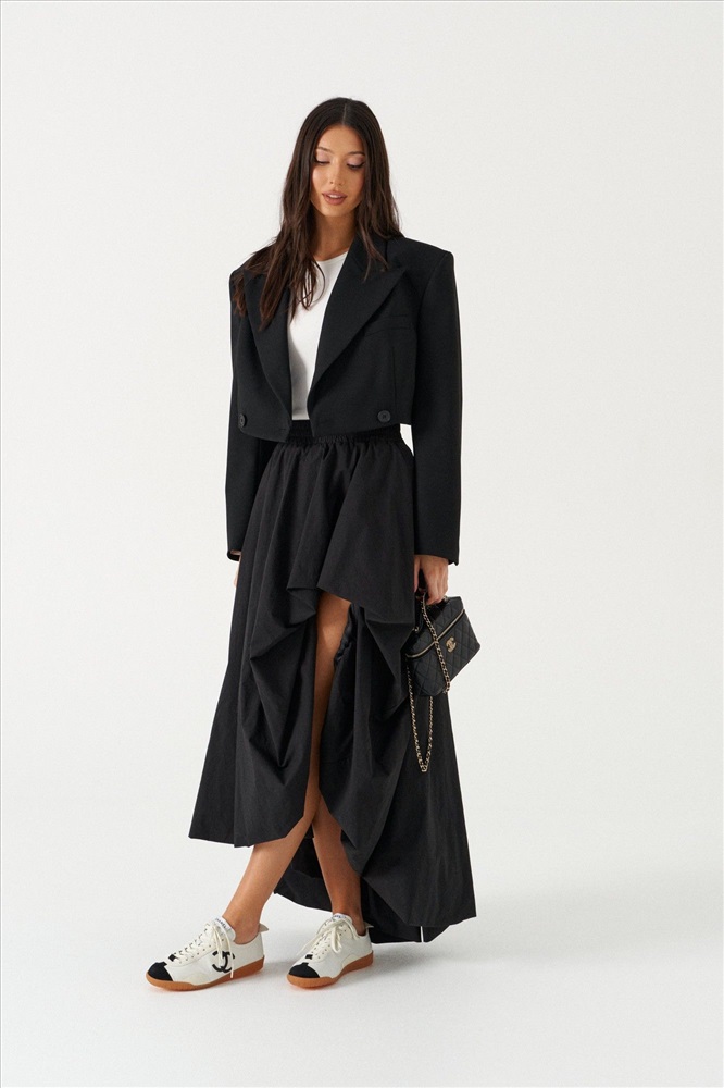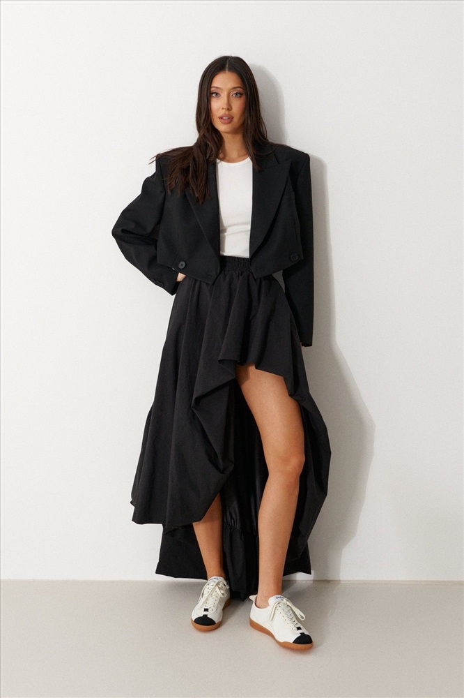 Юбка женская с фигурным низом, выполнена из полотна черного цвета. Характеристика: фигурный низ с глубоким вырезом на левом бедре, пояс на резинке, на подкладке, низ юбки на мягком подгибе. Длина юбки по самой длинной линии 99см, по самой короткой линии 34см.