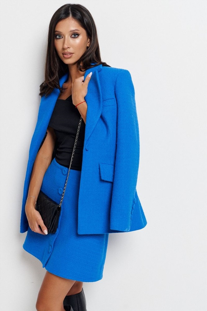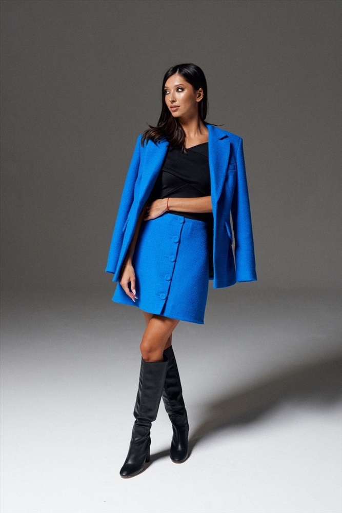 Юбка полуприлегающего силуэта выполнена из фактурного полотна насыщенного синего цвета. Характеристики: полуприлегающий силуэт, подкладка, по переду функциональные пуговицы, пуговицы декорированы тканью основного изделия Длина 45 см.