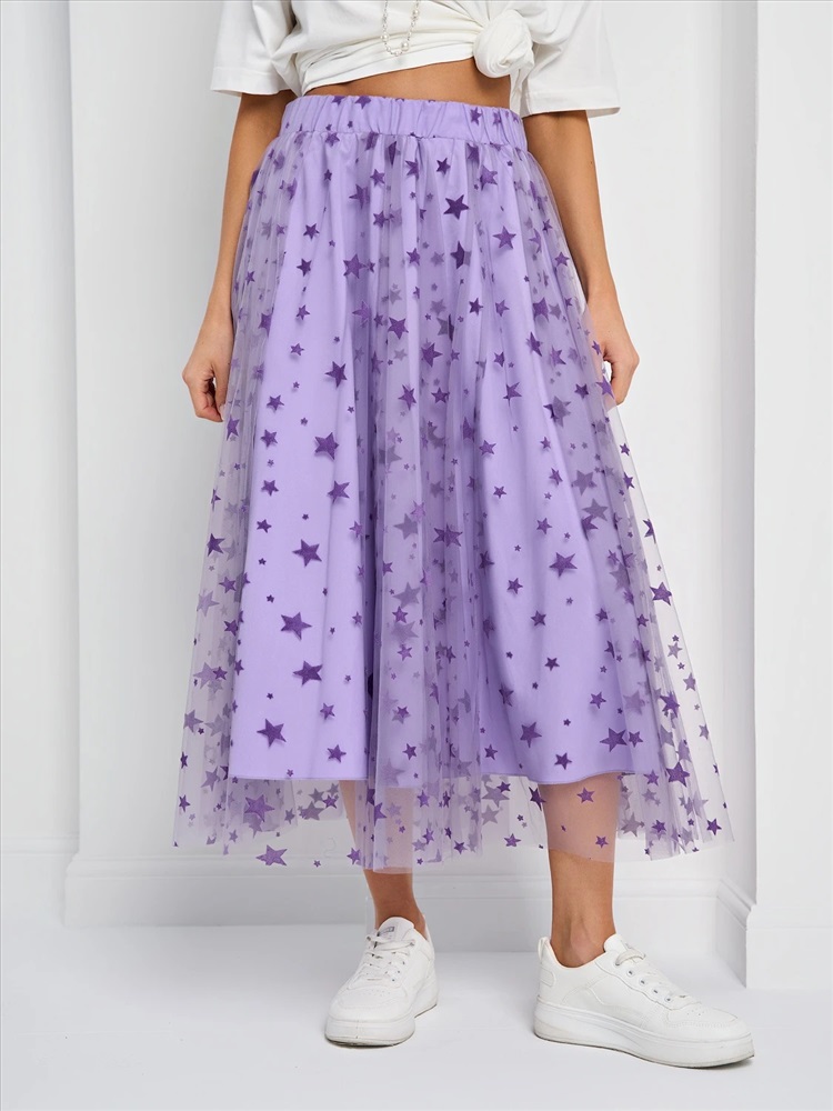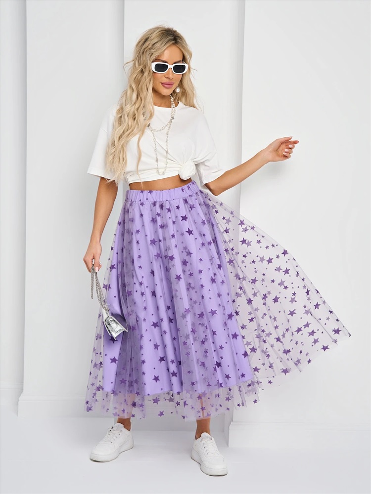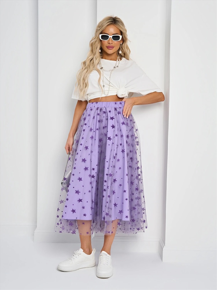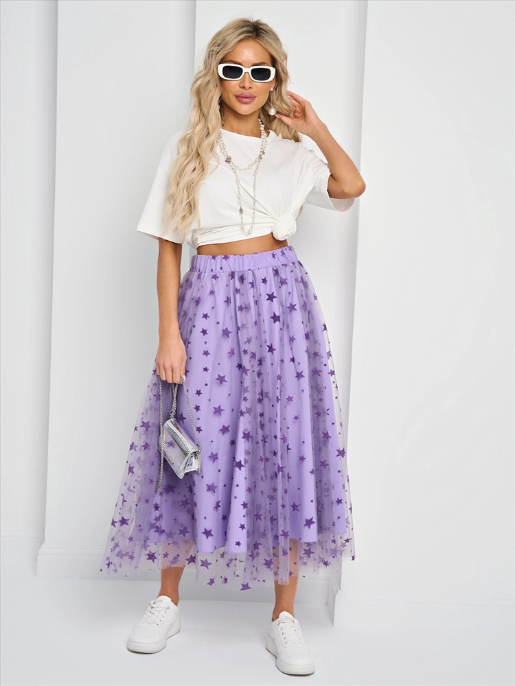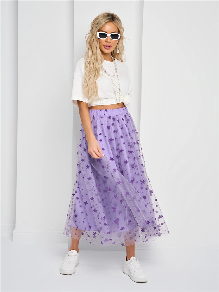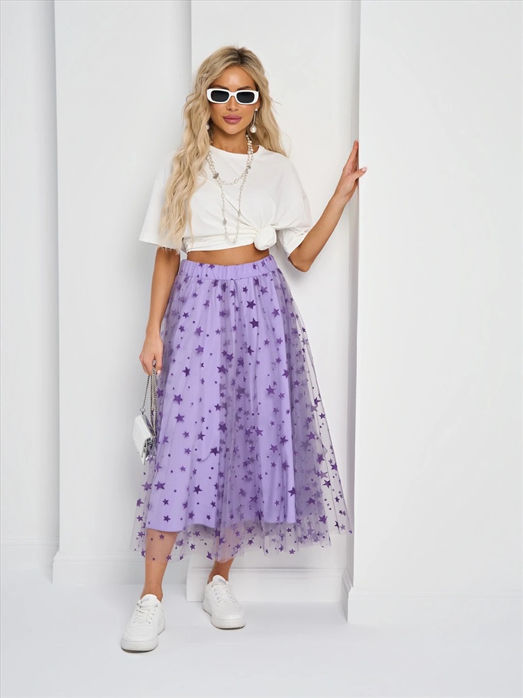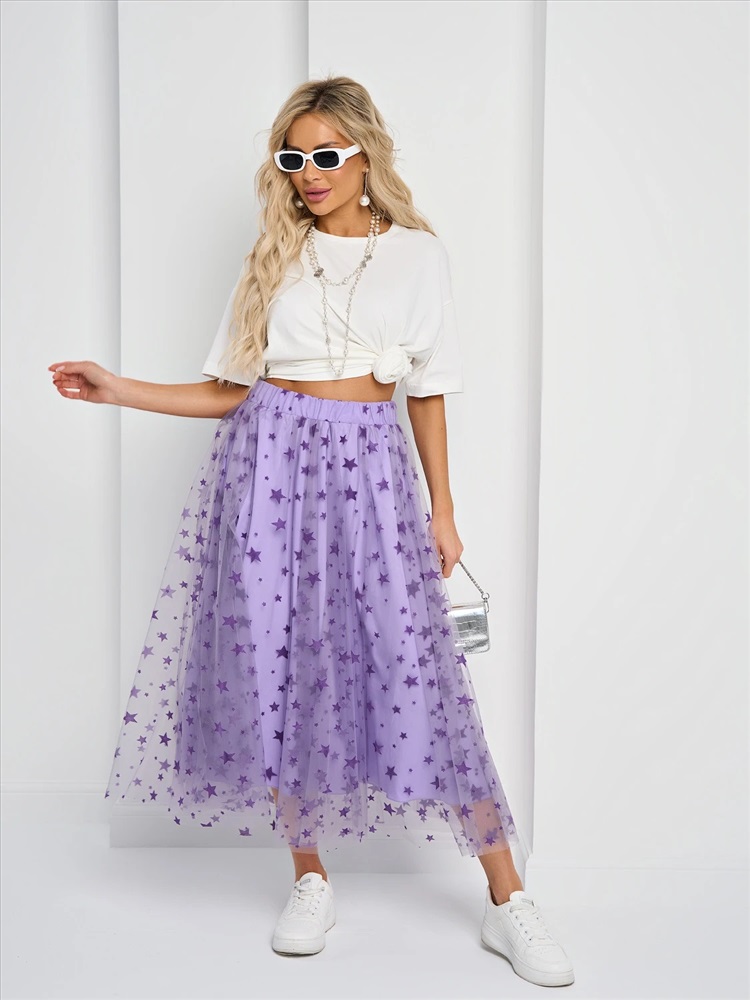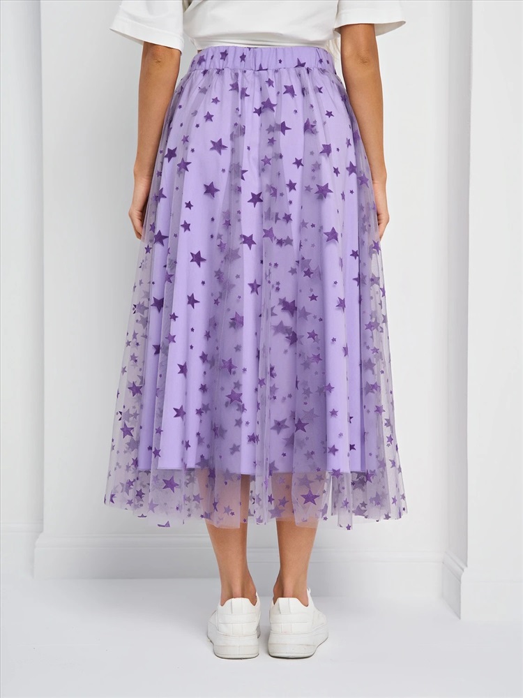 Юбка длины миди из сетки с поясом на резинке.