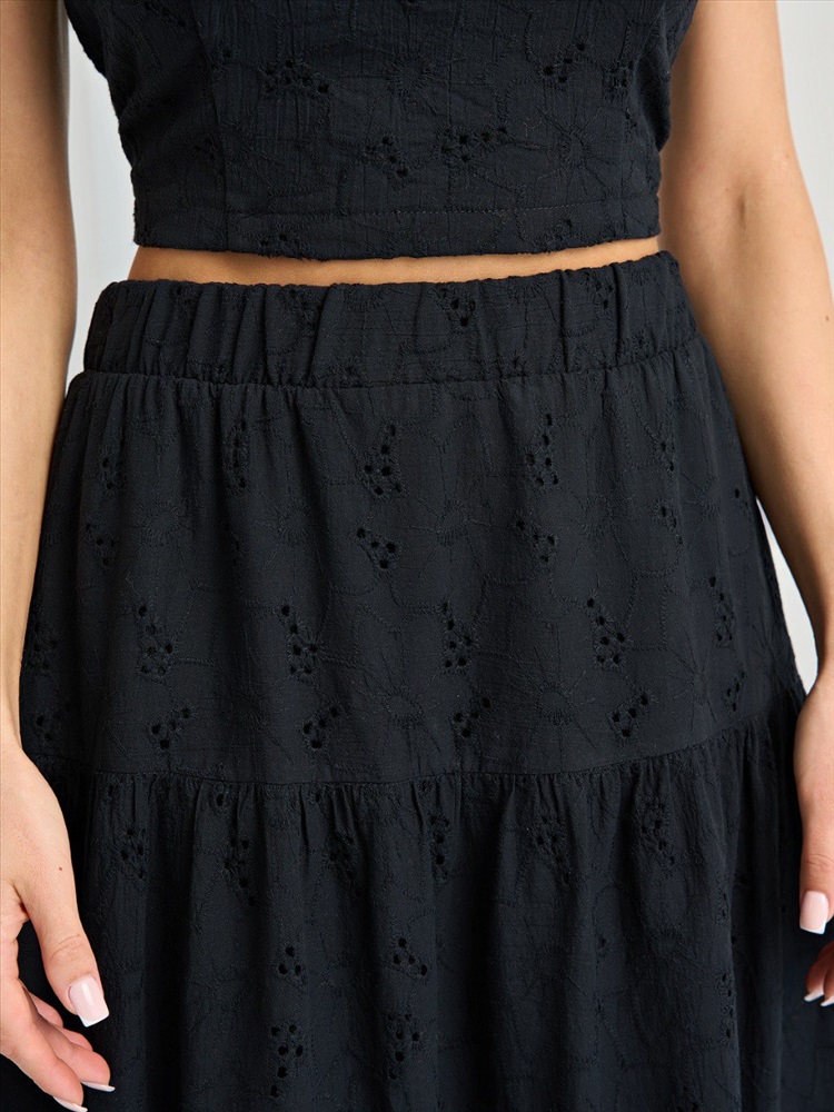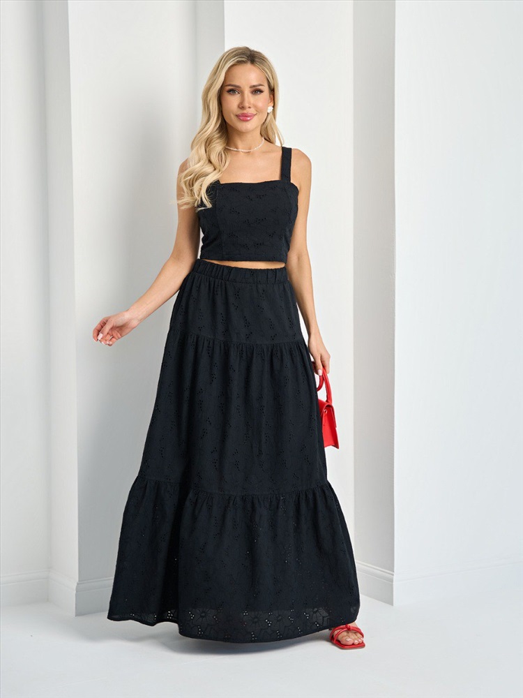 Юбка чёрная макси ярусная от компании Jetty. Модель расклешённого силуэта, выполнена из ткани шитье. Пояс на резинке. Юбка на подкладе. Идеальный выбор для городских модниц., Оттенок цвета может незначительно отличаться от фото., Длина: 104 см., Размер модели: 42., Рост модели: 170 см., Состав:, Хлопок 100%