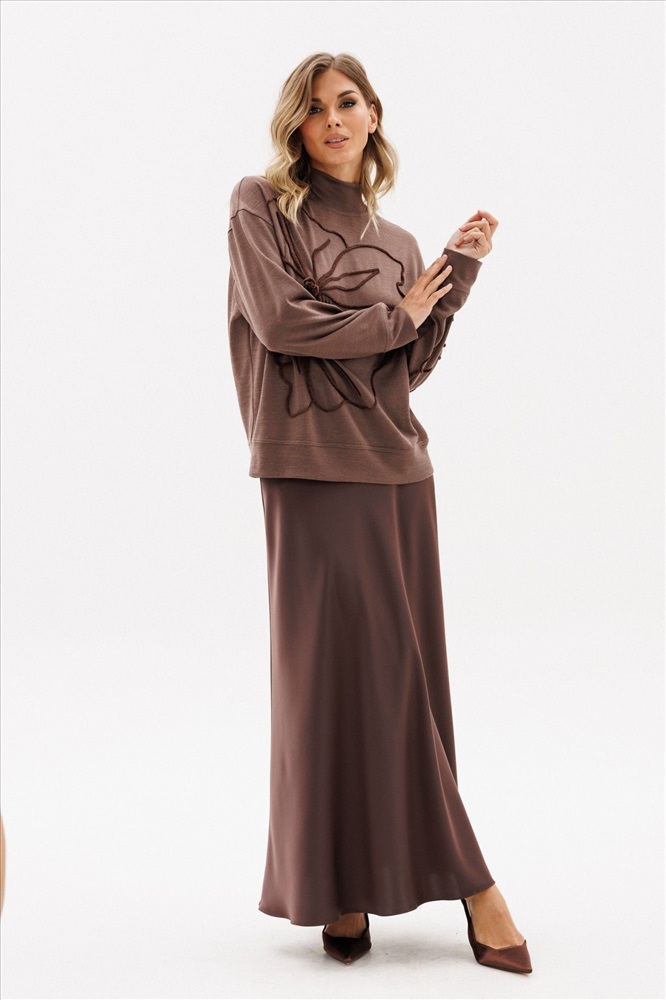 Юбка выполнена из плотного атласа. Юбка расширенная к низу, на притачном поясе, длиной миди.Переднее и заднее полотнища цельные и выкроены по косой. Застежка в левом боковом шве на потайную молнию и пуговицу. Юбка без подкладки. Длина юбки: р.44-54 -95 см. ЮБКА м. 2932 44 46 48 50 52 54 Длина по переду с поясом 95 95 95 96 96 96 Объем по талии 72 76 80 84 88 92 Объем по бедрам 112 116 120 124 128 132 Объем по низу 206 210 214 218 222 226 Ширина пояса 3,5 3,5 3,5 3,5 3,5 3,5