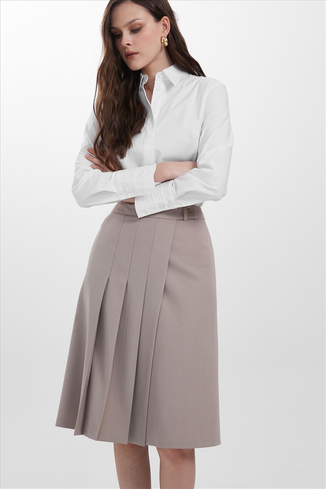 Юбка миди бежевая с запахом от фабрики Priz. Модель А-образного силуэта, без подклада, на подкройном поясе. На поясе шлёвка и застёжка на петли и пуговицы. Спереди частично застрочены односторонние складки. Комфорт и стиль на каждый день., Оттенок цвета может незначительно отличаться от фото., Ожидание отправки (рабочих дней): 7, Длина: 42 р - 66,5 см, 54 р - 66,5 см., Размер модели: 44., Рост модели: 174 см., Состав:, Вискоза 58%, Полиэстер 40%, Эластан 2%, Тип ткани:, Текстиль