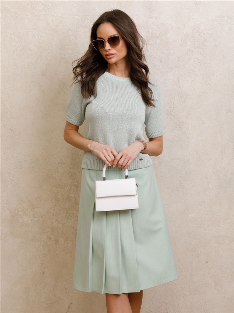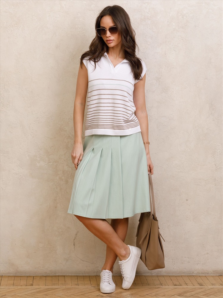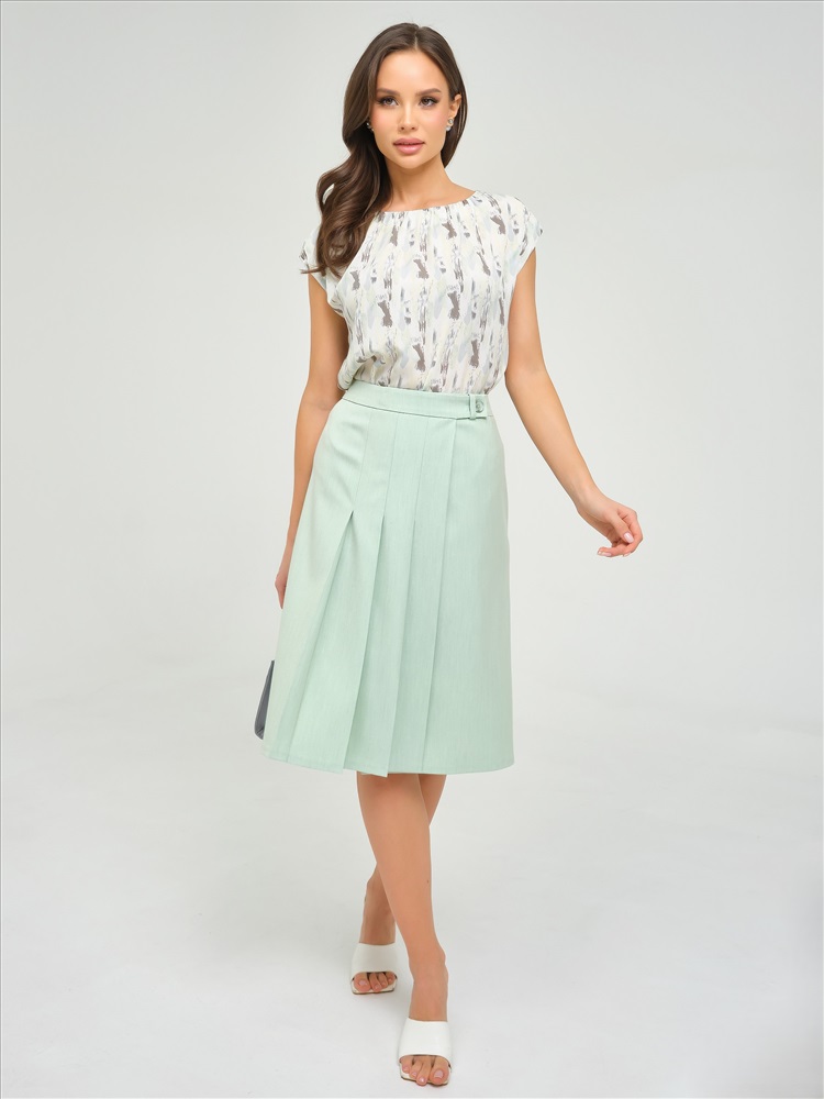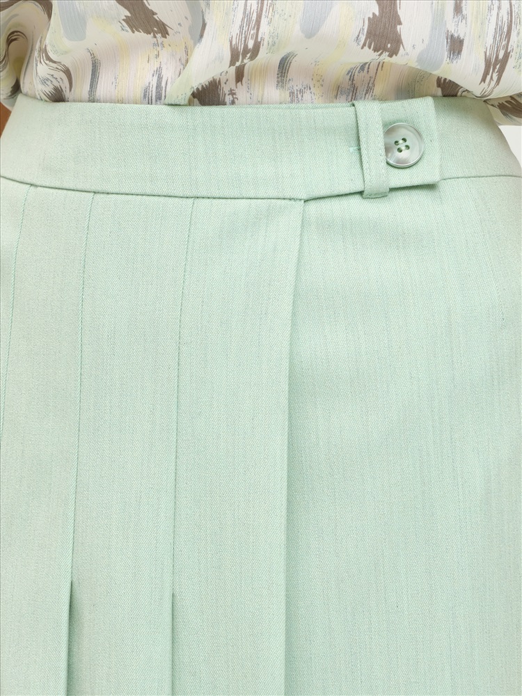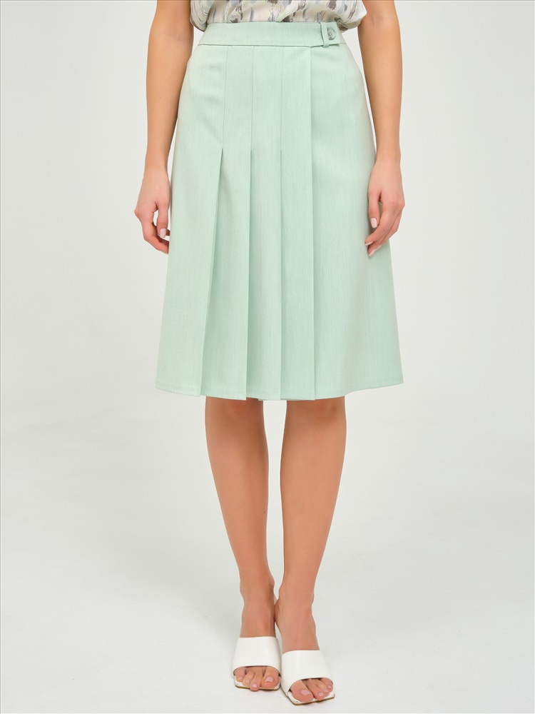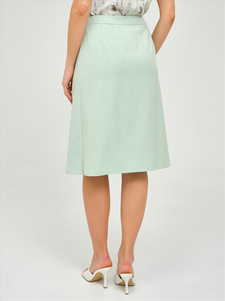 Юбка миди с запахом от фабрики Priz. Модель А-образного силуэта, без подклада, на подкройном поясе. Выполнена из текстильного полотна бледно-зелёного цвета. На поясе шлёвка и застёжка на петли и пуговицы. Спереди частично застрочены односторонние складки. Комфорт и стиль на каждый день., Оттенок цвета может незначительно отличаться от фото., Ожидание отправки (рабочих дней): 7, Размер модели: 44., Рост модели: 174 см., Состав:, Вискоза 50%, Полиэстер 46%, Эластан 4%, Тип ткани:, Текстиль