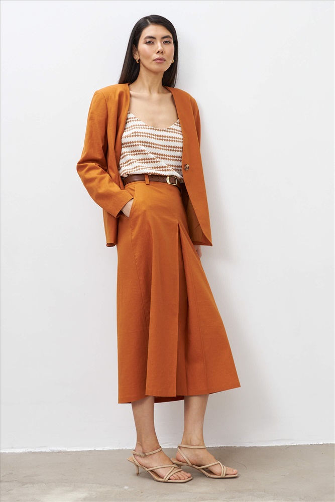 Материал: Лён Состав: 70% лен 30% вискоза Длина: 87 см. Цветовая гамма: Охра Силуэт: А-силуэт Принт: Нет Коллекция: Summer №4