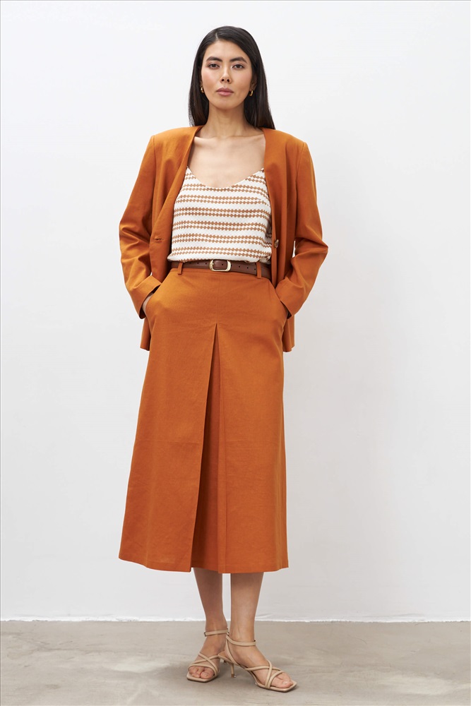 Юбка длины миди из льняного полотна. Модель А-силуэта со встречной складкой. Боковые карманы, по линии талии шлевки. Застежка по спинке на потайную молнию.