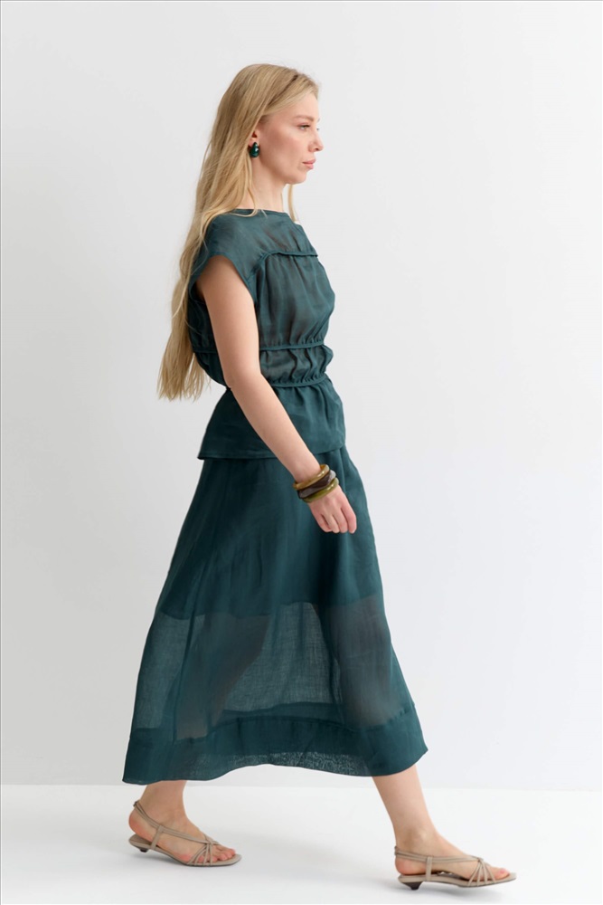 Состав: 100% Крапива Длина: 85 см. Цветовая гамма: Темный изумруд Силуэт: А-силуэт Принт: Нет Коллекция: Весна #2 Юбка длины миди из 100% крапивы для любого случая. Модель свободная А-силуэта с втачным поясом на кулиске и шнурком из основной ткани. По низу изделия отрезная манжета. Комментарии к товару