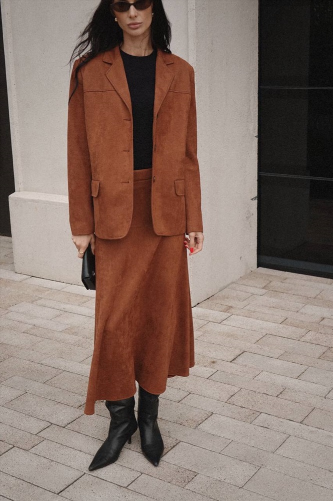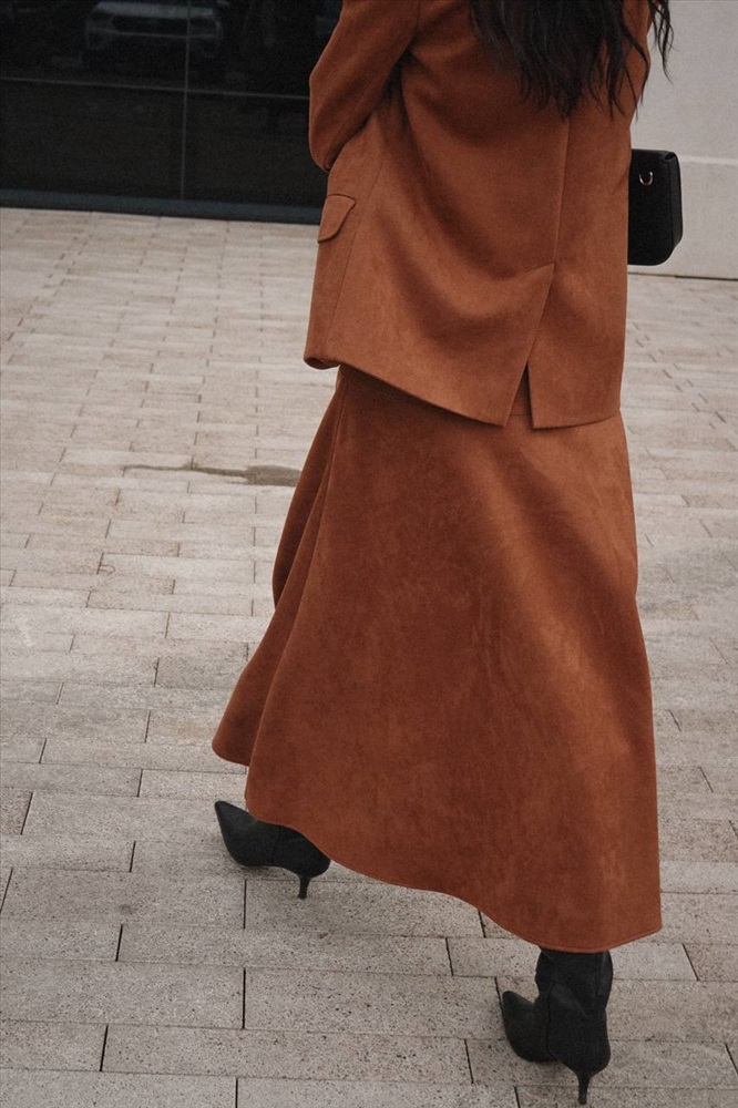 Женственная юбка из эко замши в ретро стиле. Юбка А-силуэта с притачным поясом и отрезной кокеткой + шлевки, застежка на потайную молнию в боковом шве.