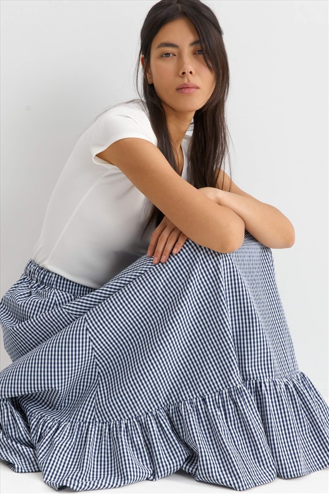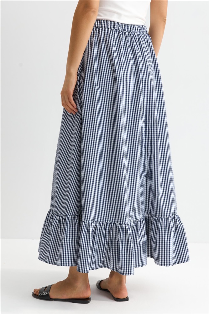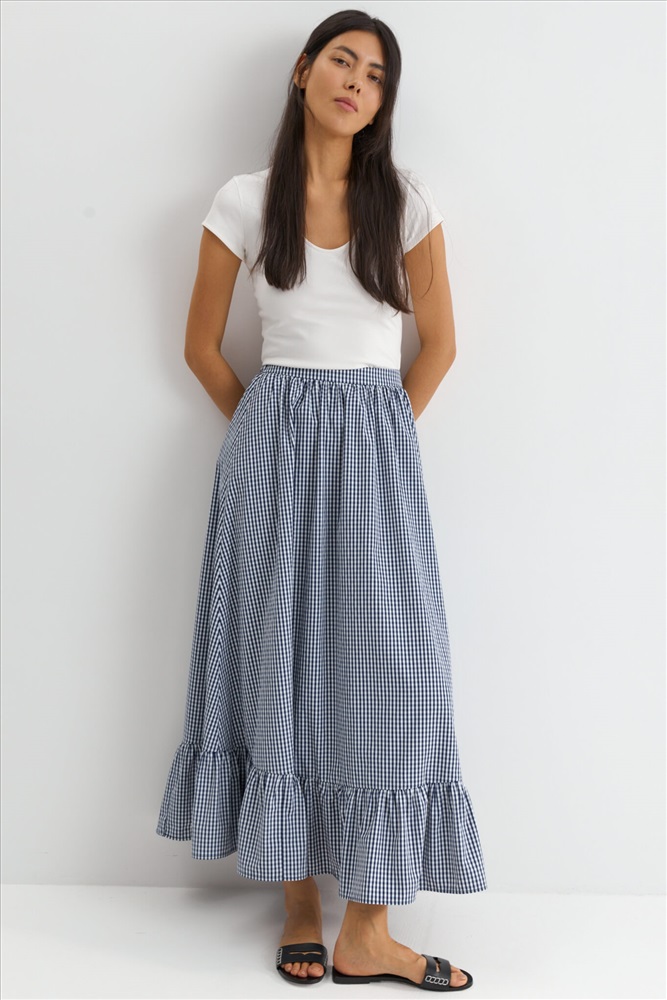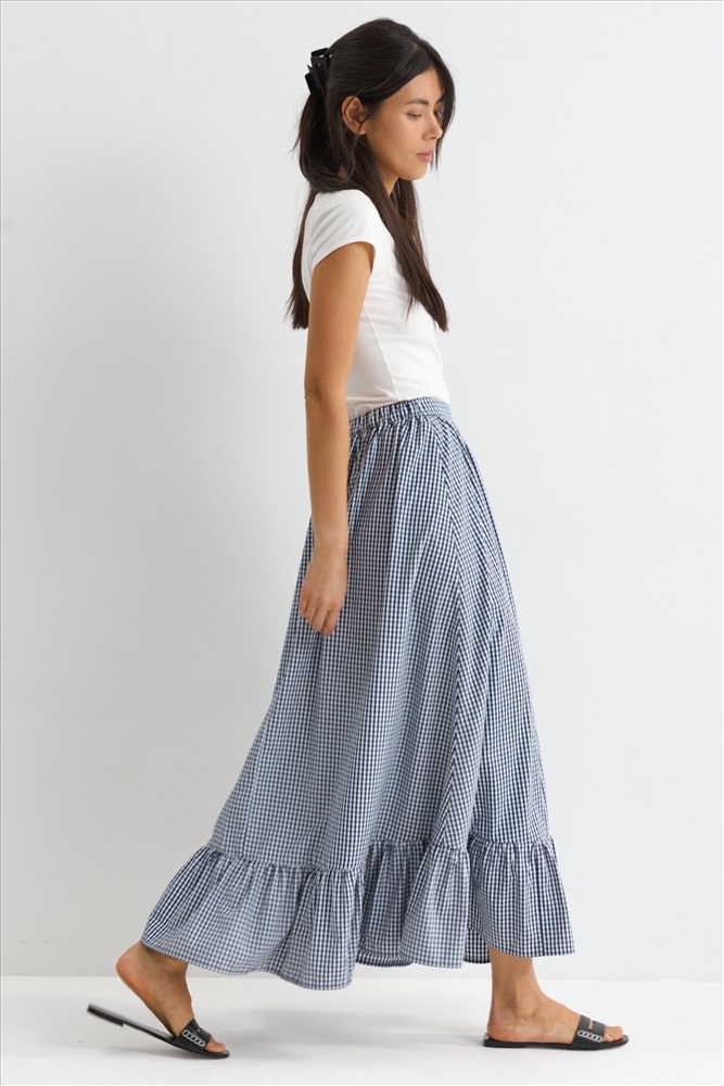Состав: 50% Хлопок 50% ПЭ Цветовая гамма: Молочный/темно-синяя клетка Силуэт: А-силуэт Принт: Да Коллекция: Лето #3 Акцентная юбка длины макси с воланом. Модель свободного А-силуэта на притачном поясе. По спинке резинка для комфортной посадки. По низу широкий волан на легкой сборке. Комментарии к товару