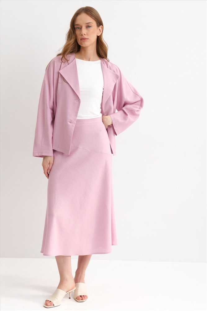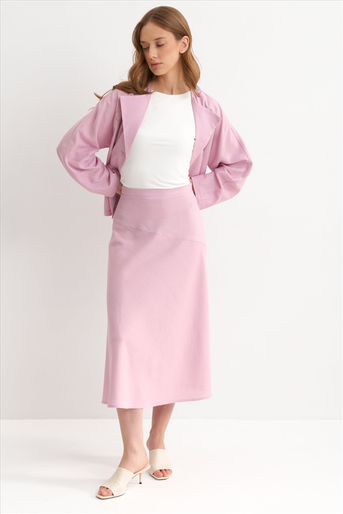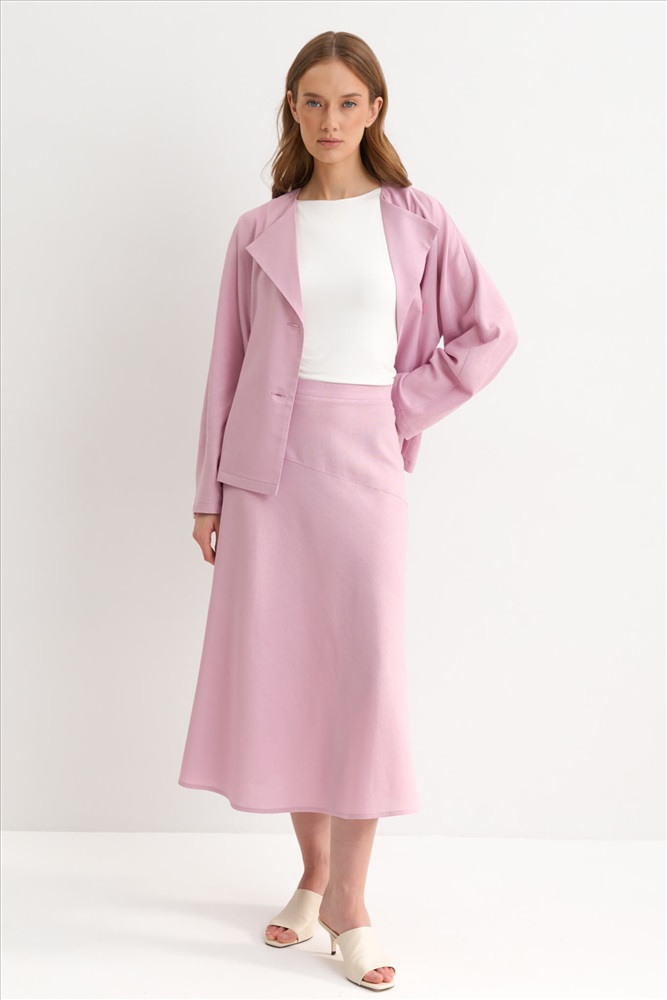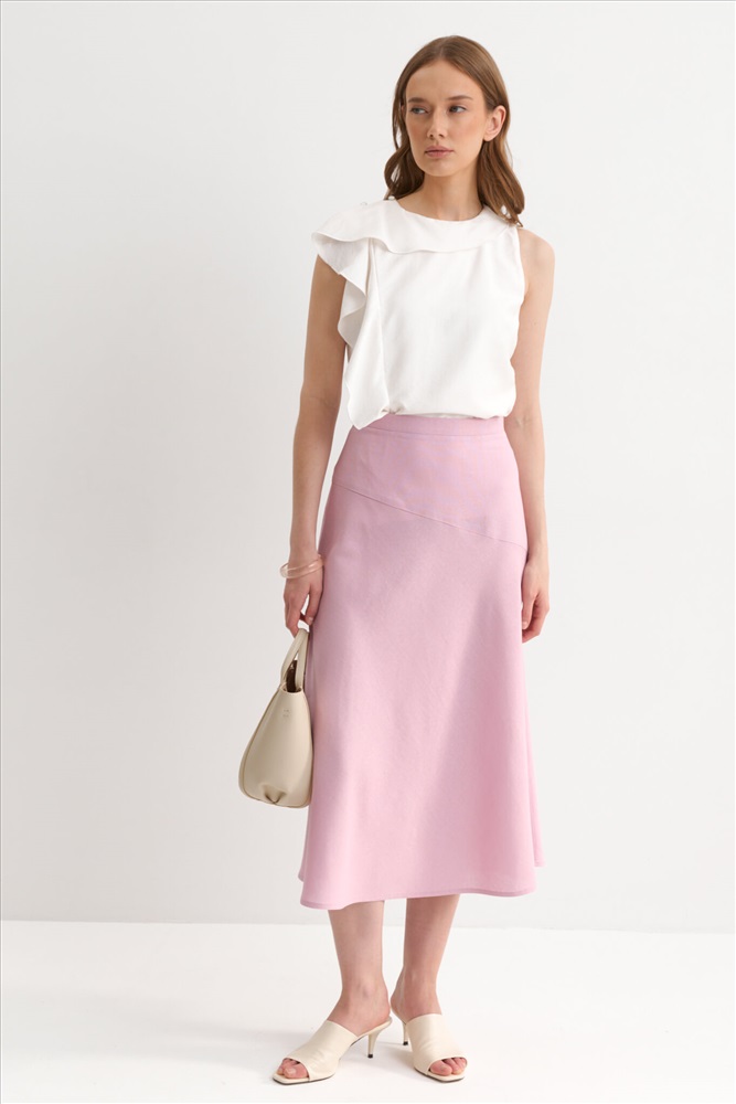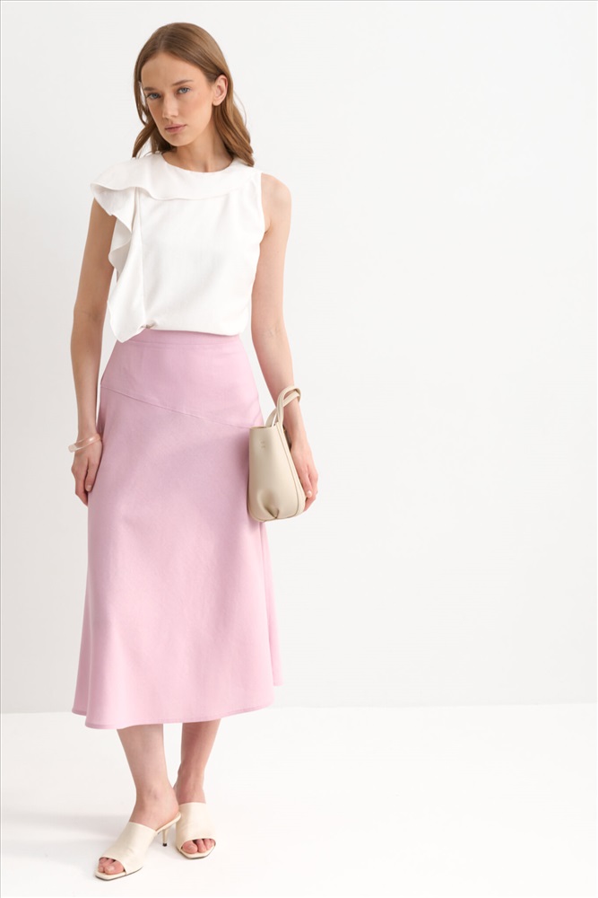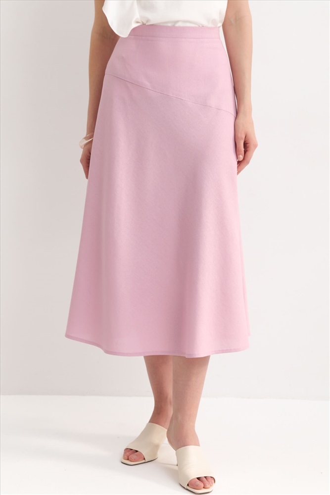 Состав: 70% Лен 30% Вискоза Длина: 85 см. Цветовая гамма: Пыльная роза Силуэт: А-силуэт Принт: Нет Коллекция: Лето #4 Юбка из льняного полотна длины миди. Модель А-силуэта. Фигурный подрез. Притачной пояс. Застежка на потайную молнию в боковом шве. Изделие на подкладке. Комментарии к товару