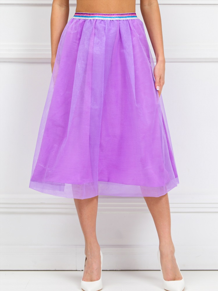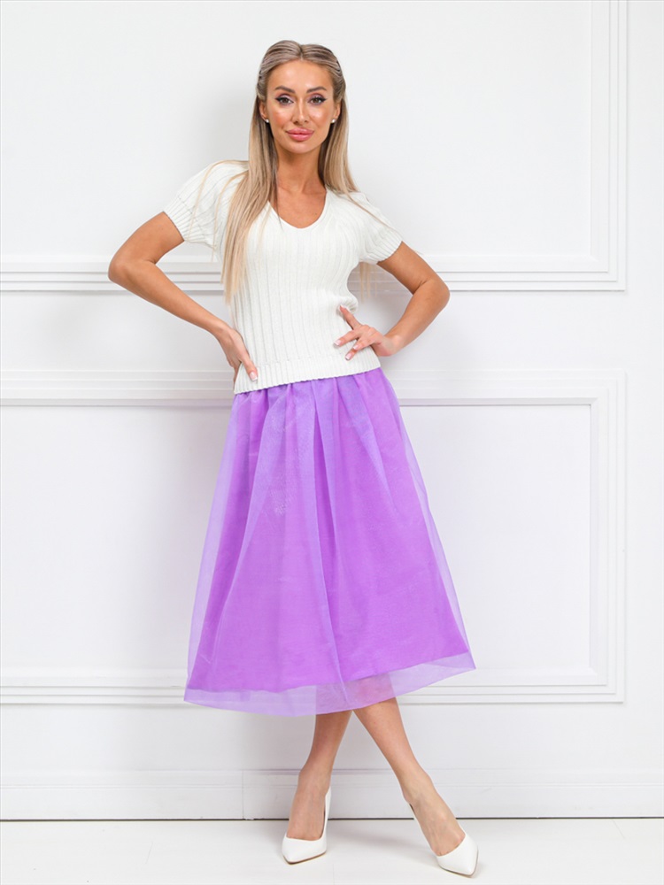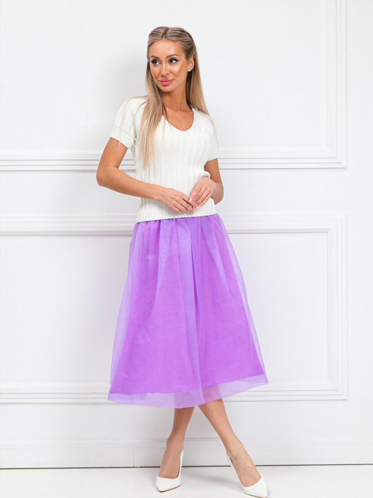 Роскошная юбка в форме баллона из текстильной ткани сиреневого цвета. Юбка двойная, сетка на текстильной основе. Верхний край юбки обработан декоративной резиной с люрексом. Длина изделия от пояса до низа изделия — 73 см. Рост фотомодели - 170 см.