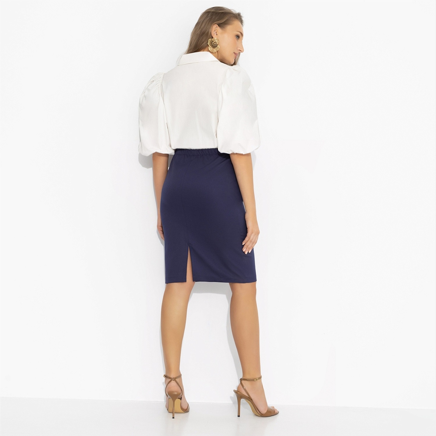 Руководитель принимал её такой, какая она есть. Правда, параллельно принимал успокоительное... Ещё бы, когда такая женщина заходит в кабинет, сложно сохранить самообладание. Юбка-карандаш с высокой посадкой собирает силуэт, подчёркивает бёдра и задаёт уверенный ритм шага. Длина работает на элегантность, а глубокий синий добавляет холодной притягательности. Спокойно, точно и очень эффектно – это про тебя.
