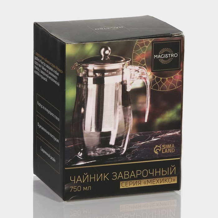 Производитель: Magistro; Габариты: 12 x 10 x 15,5; Страна: Китай; В боксе: 60 шт; Состав: Полипропилен, коррозионностойкая сталь, боросиликатное стекло; Материалы: полипропилен, Коррозионностойкая сталь, боросиликатное стекло; Фасовка: по 1 шт; Индивидуальная упаковка: Картонная коробка; Габариты товара: 12 см × 9,5 см × 15,5 см; Сертификат: РСТ; Набор: Нет; Цвет: Прозрачный; Объём, мл: 750; Вид упаковки: Коробка картонная; Рисунок: Нет; Материал крышки: Металл; Для детей до 3 лет: Нет; Можно мыть в посудомоечной машине: Да; Комплектация: Сито; Матовая поверхность: Нет; Материал сита: Металл; Материал чайника: Стекло; Фиксированная цена: Да