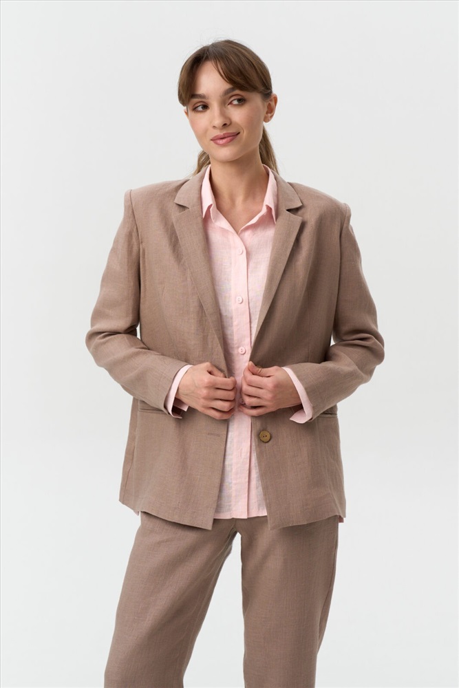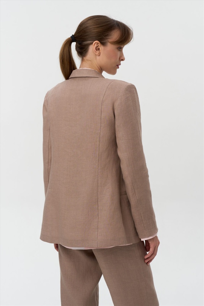 Жакет женский полуприлегающего силуэта с прорезным карманом в рамку и рельефами по спинке. Рукав втачной двухшовный длинный. Застёжка центральная на 2 пуговицы. Воротник «английский» пиджачного типа.