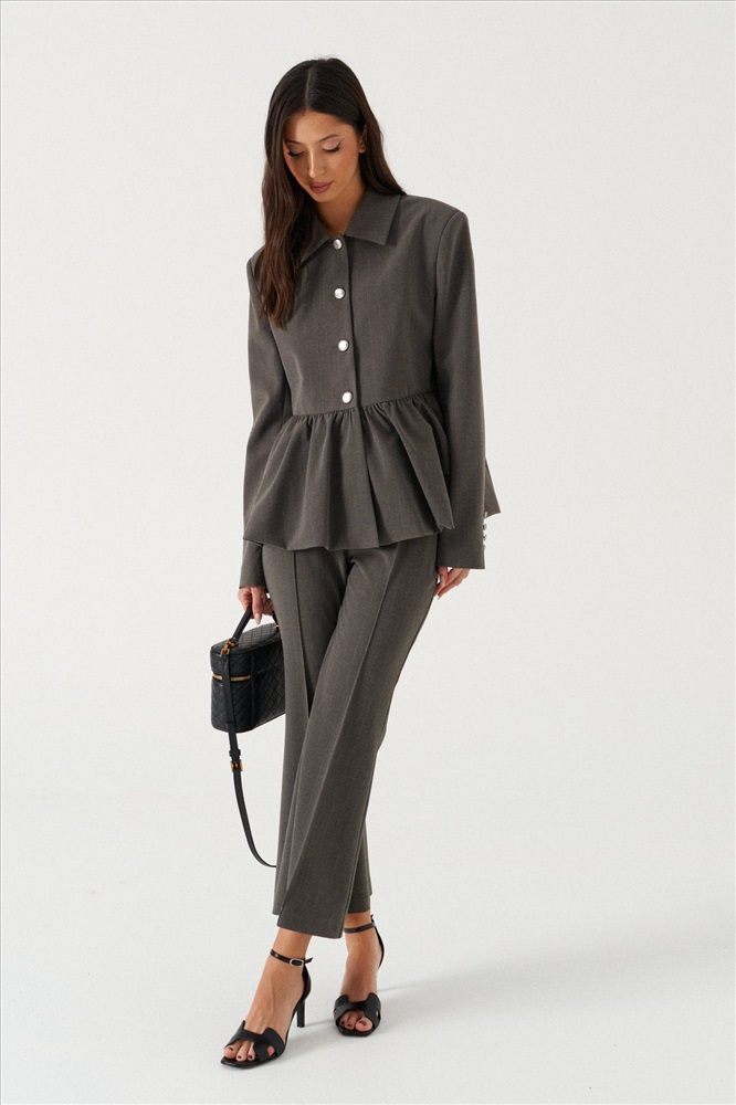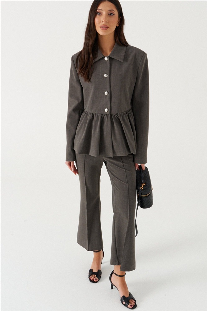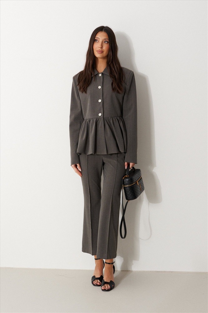 Жакет прямого кроя серого цвета с полоской, с баской по нижней части изделия. Выполнен из костюмной ткани. Характеристики: на подкладке, отложной воротник, застежка центральная на пуговички, рукав втачной. Длина по спинке от края горловины 62 см, длина рукава 77 см.