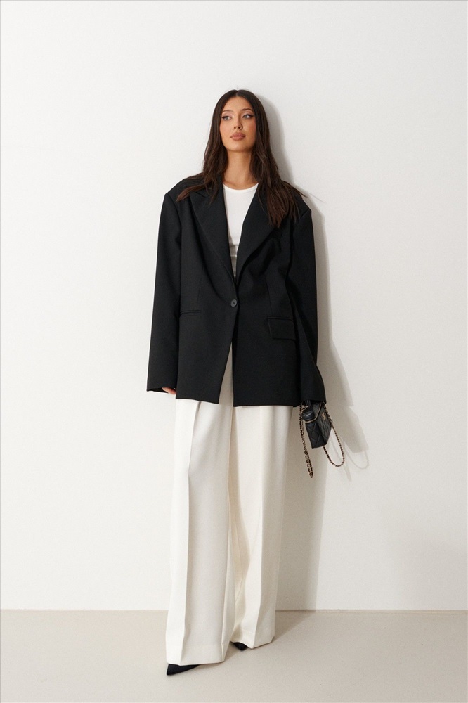 Жакет прямого свободного кроя выполнен из костюмной ткани черного цвета. Характеристики: прямой свободный крой, брендированная подкладка, подплечники, воротник с остроугольным лацканом, застежка центральная на петлю - пуговицу, по переду функциональные карманы с клапаном, рукав к низу расклешен, втачной, чуть спущен, по низу рукава нашиты пуговички, спинка цельнокроеная. Длина по спинке 77, длина рукава от края горловины 84 см.