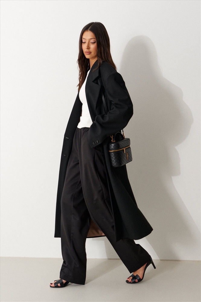 Жакет прямого свободного кроя, выполнен из костюмной ткани черного цвета. Характеристика: V-образный вырез горловины, отложной воротник, застежка центральная на две петли пуговицы, функциональные карманы с клапанами, брендированная подкладка, широкое плечо, подплечники, рукав втачной, на манжете функциональные пуговицы, в среднем шве заднего полотна изделия шлица 51 см. Длина изделия по центральному щву по спине 118 см, длина рукава от края горловины 84 см.