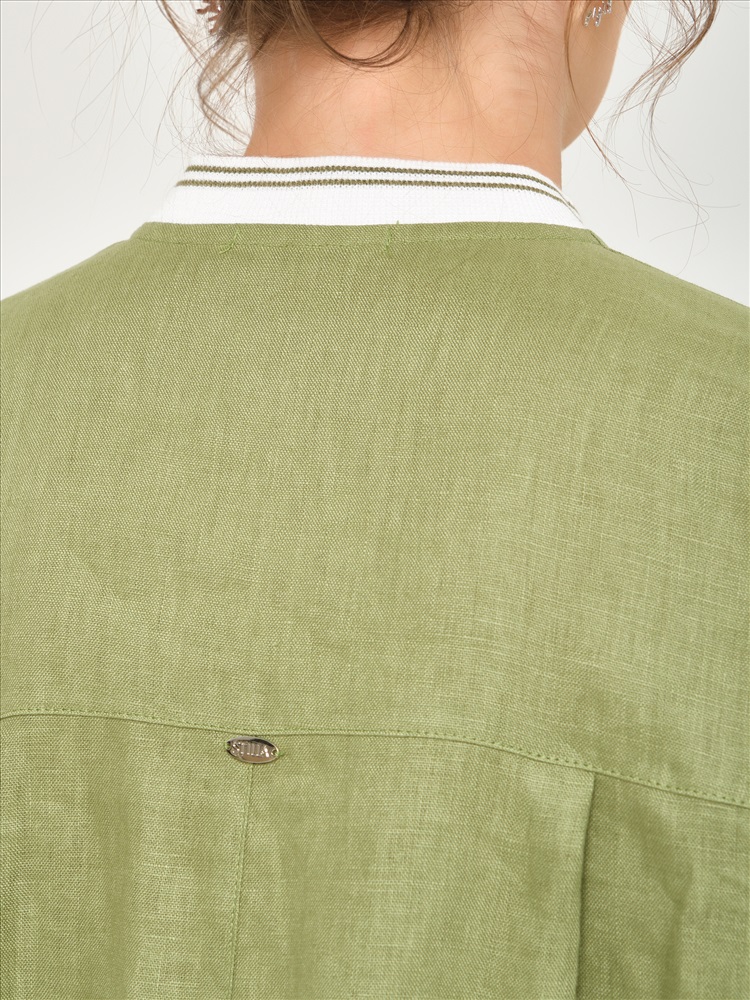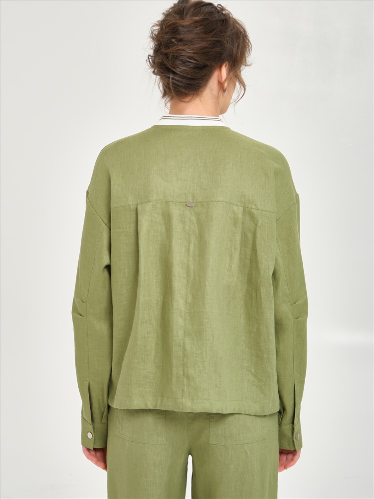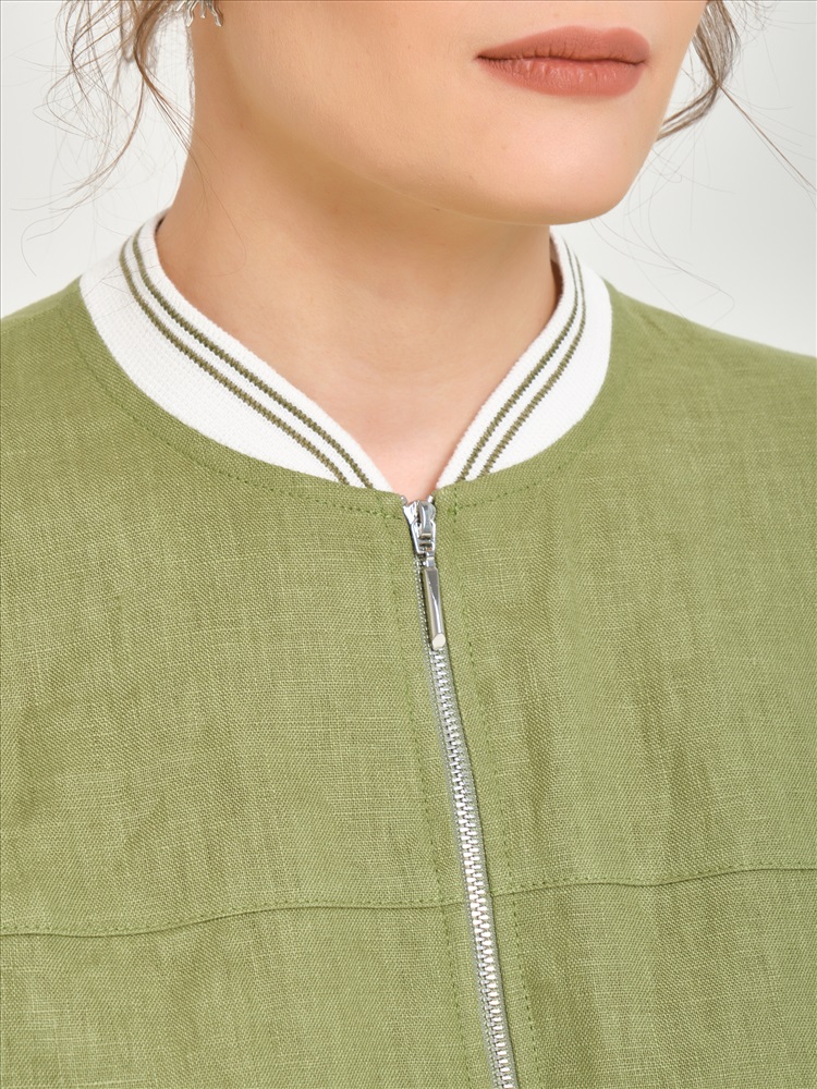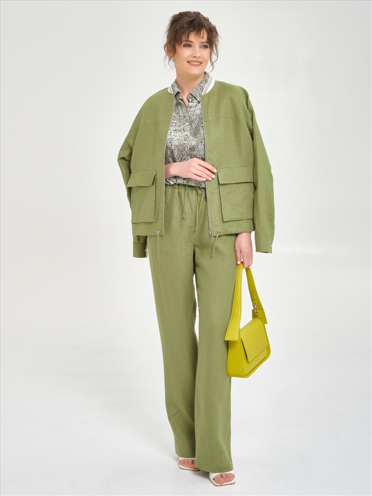 Жакет бомбер на молнии от фабрики PRIZ. Модель прямого силуэта, выполнена изо льна цвета бледный лайм, со спущеным плечом, без подклада. Спереди кокетки, фигурные накладные карманы "портфель" с клапанами. Спинка с кокеткой и средним швом. Под кокеткой защипы. Низ жакета обработан кулисой, в которую через люверсы вставлен шнурок. Горловина обработана вязаным воротником стокой. Рукав с защипами, по низу разрез и манжета с застёжкой на кнопку. Практичный вариант для создания повседневного гардероба., Оттенок цвета может незначительно отличаться от фото., Ожидание отправки (рабочих дней): 7, Длина: в 42 р-ре - 60 см, в 54 р-ре - 64,5 см., Размер модели: 44., Рост модели: 174 см., Состав:, Лён 100%, Тип ткани:, Лён