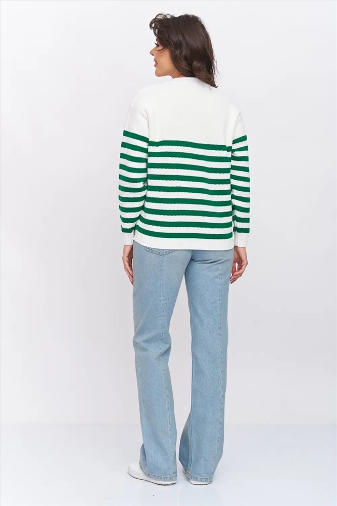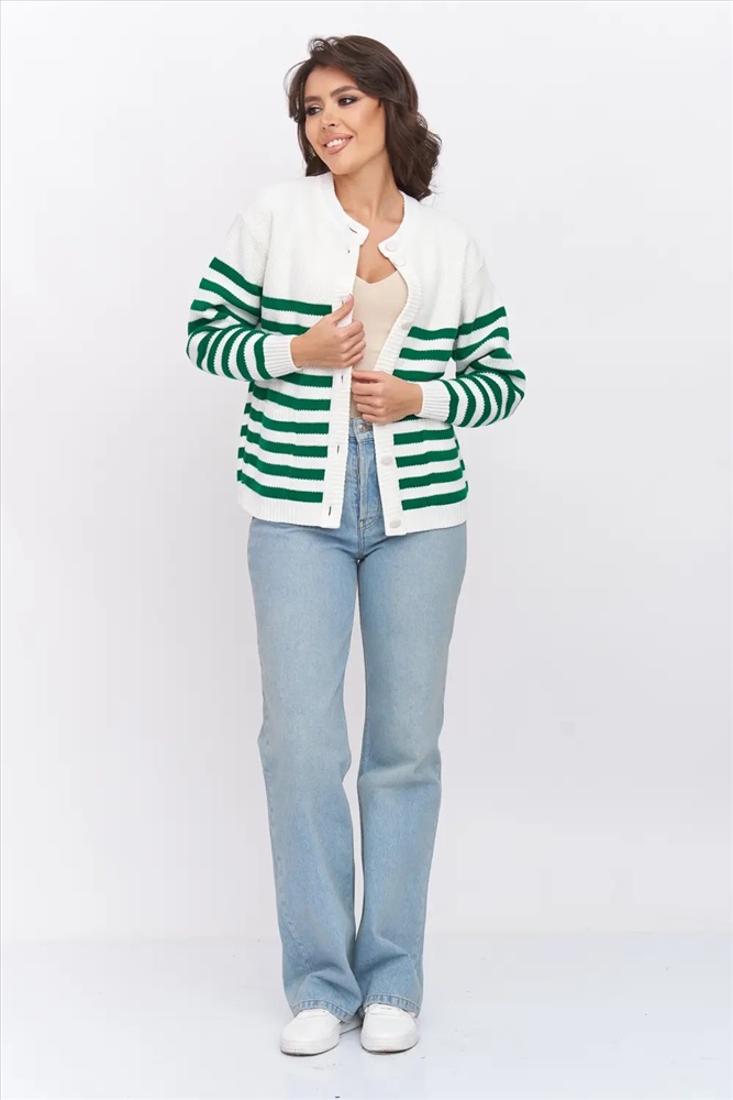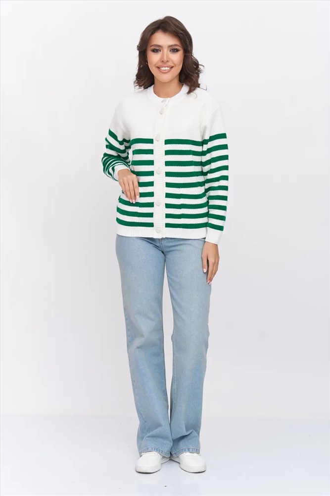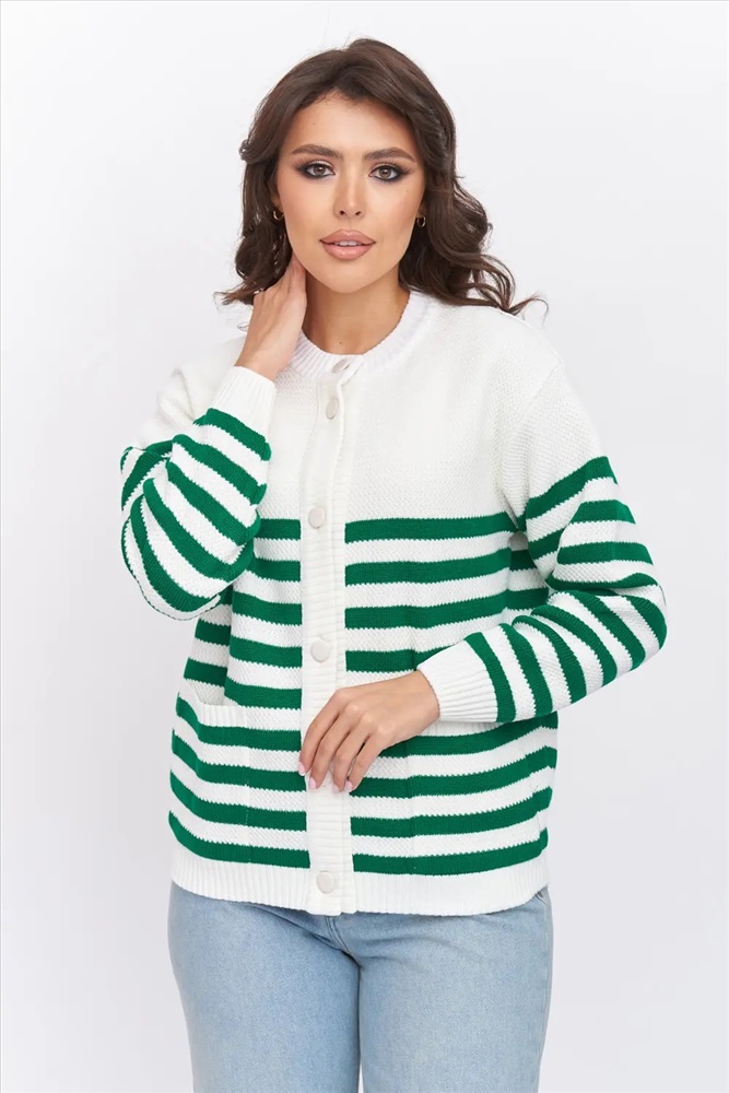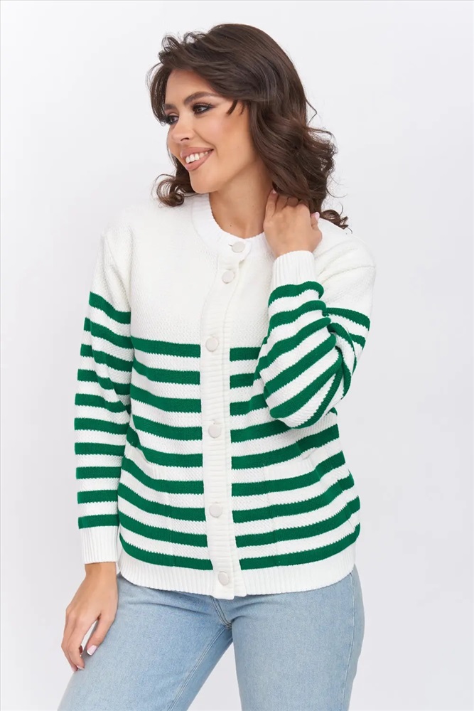 Жакет женский вязаный полуприлегающего силуэта на пуговицах в полоску с круглой горловиной. Спущенная линия плеча, рукав длинный. Манжет рукава, низ изделия и планка выполнены эластичная резинкой. Жакет выполнен из качественной пряжи с составом 30% шерсть 70% ПАН. Легкий, яркий, эффектный жакет поддержит и деловой образ, и праздничное настроение. Отлично сочетается с любым низом в комплекте. Модель классическая, праздничная и повседневная, абсолютно на любой случай жизни.