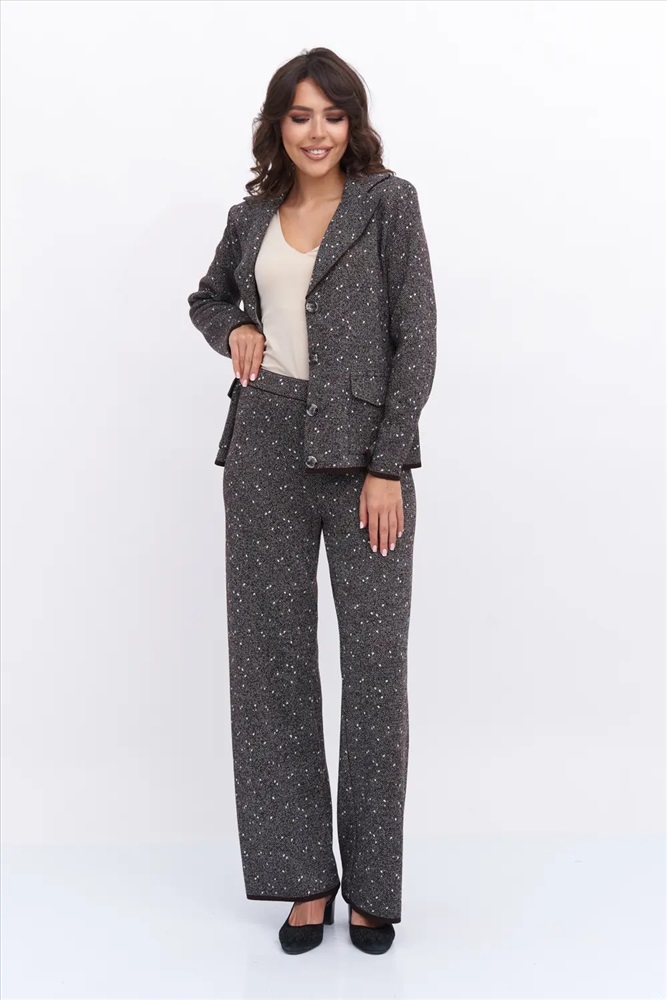Женский вязаный жакет прямого силуэта с V-образным вырезом, английским воротником. Рукав втачной длинный. Застёжка на пуговицы. Два накладных кармана с клапаном. Изделие выполнено жаккардовым переплетением. Жакет подойдет для работы в офис и деловых встреч, в нем Вы будете выглядеть модно, но при этом лаконично и сдержанно.