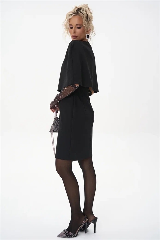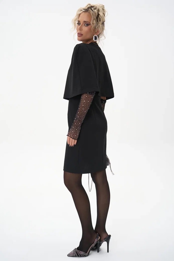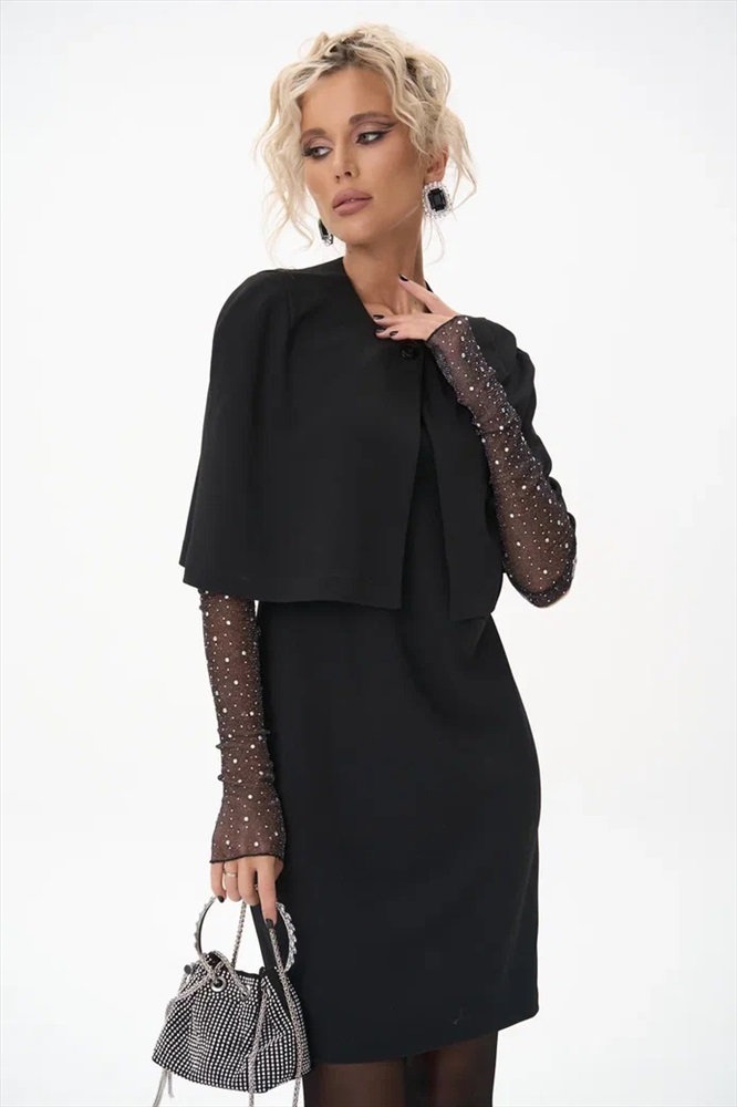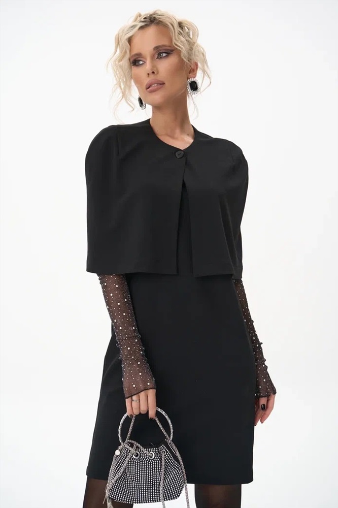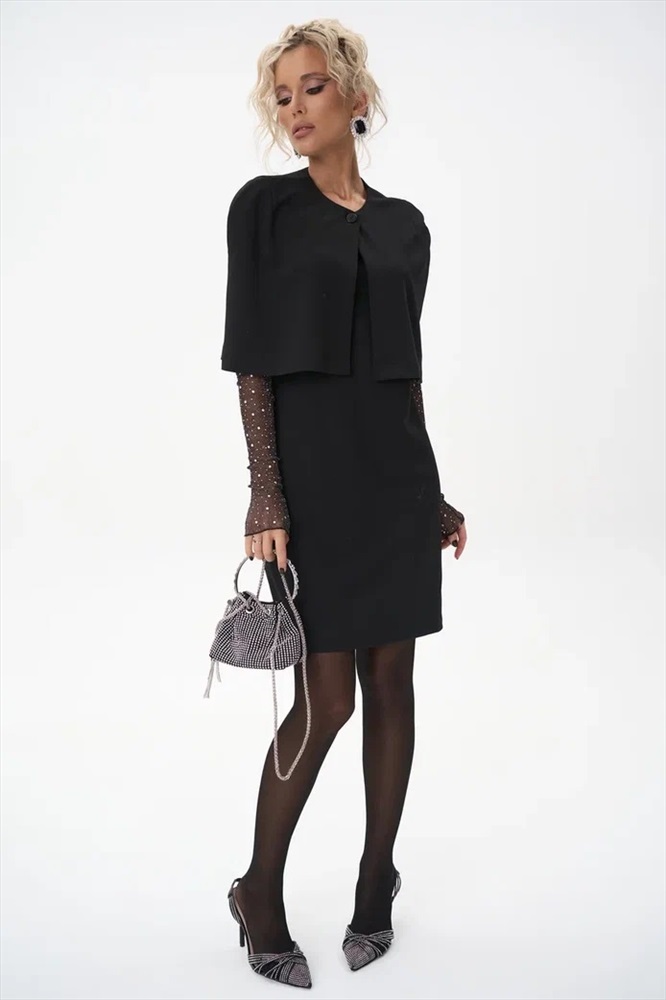 Трендовый жакет кейп для самых модных, обладающих изысканным стилем. Выполнен из трикотажа. Подойдет на любой размер. Украсит любой повседневный и праздничный образ. Сочетайте его с платьем “Лола” или с платьем – рубашка “Пэрис” для элегантного лука.