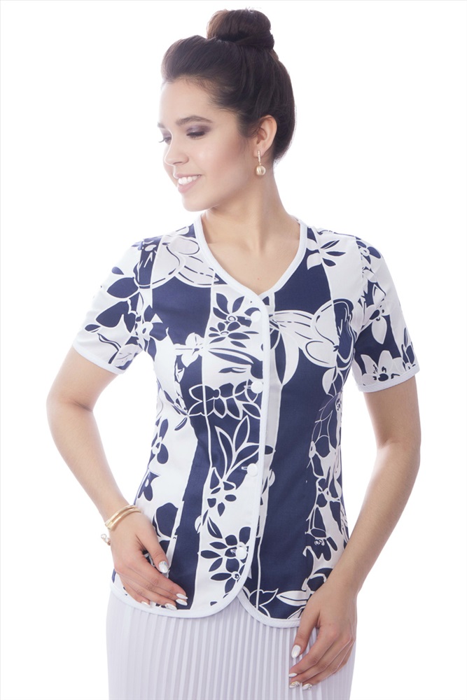 Восхитительный жакет полуприлегающего силуэта из текстильного полотна бело-синего цвета. Фигурный вырез горловины, рукава, планка, перед и низ изделия обработаны окантовкой. По переду жакета застежка на пуговицы.
