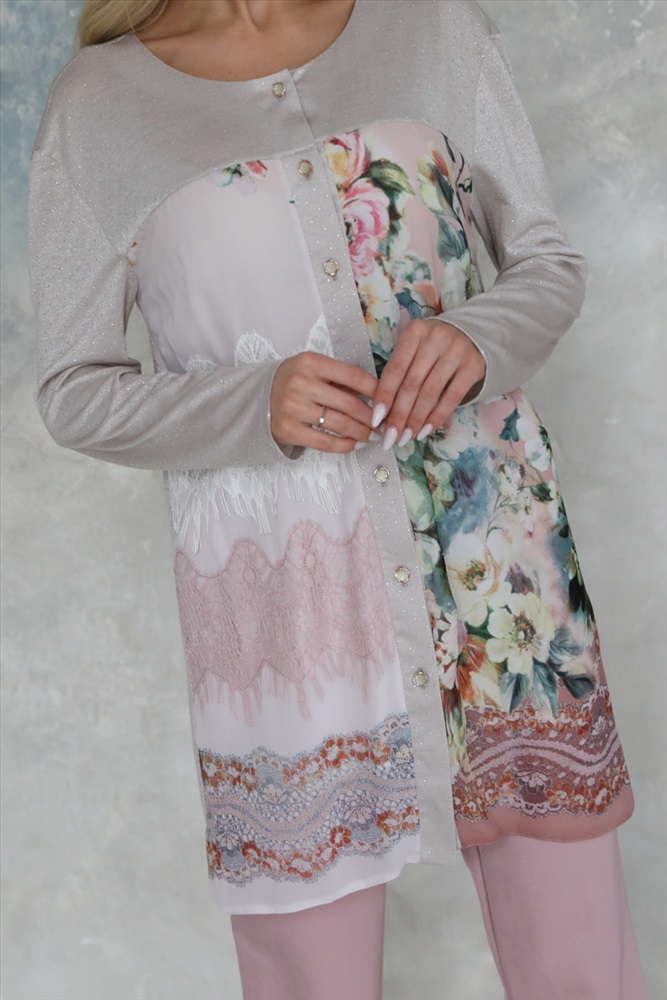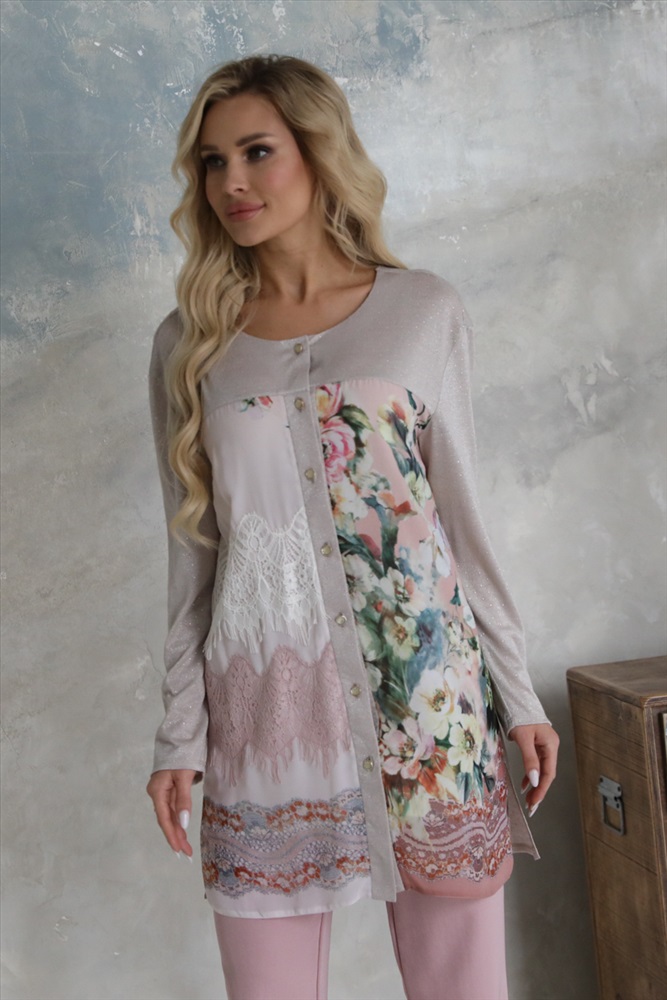 По размеру: 42 Состав: Вискоза 95% Эластан 5% ШтрихКод: 4650333150338 Скидка на сайте: 50% Срок готовности: 2017-12-24T00-00-00 Изящный удлиненный жакет полуприлегающего силуэта из трикотажного полотна пудрового цвета с металическим нанесением. Круглый вырез изделия обработан внутреней обтачкой. Жакет с втачными рукавами. Перед изделия двойной, верхний слой выполнен из тонкого шифона и посажен на однотонный текстильный подклад. Перед жакета дополнен планкой с застежкой на пуговицы и украшен кружевом. В боковых швах жакета разрезы. Аксессуары в комплект не входят. Длина изделия по спинке от плечевого шва до низа — 82см. Рост фотомодели — 170 см. Комментарии к товару