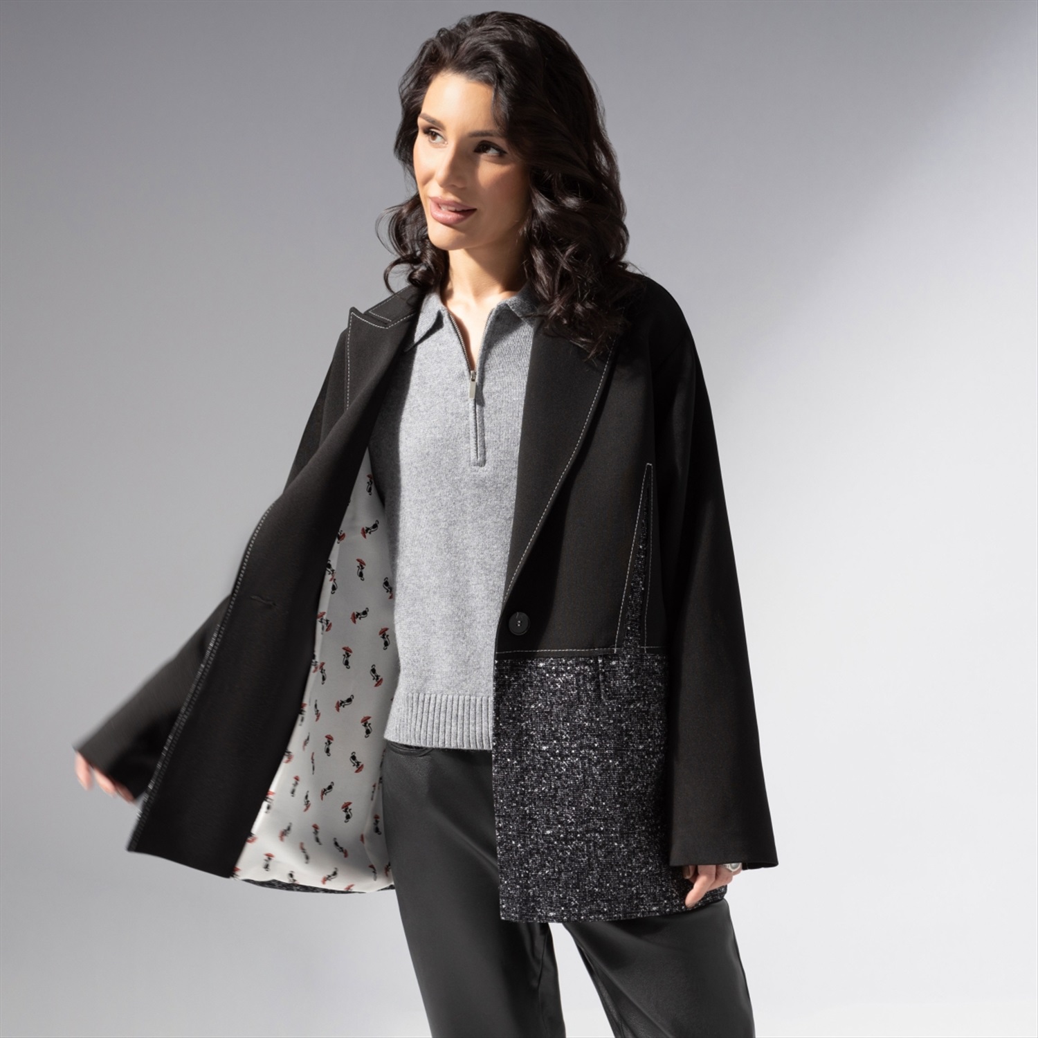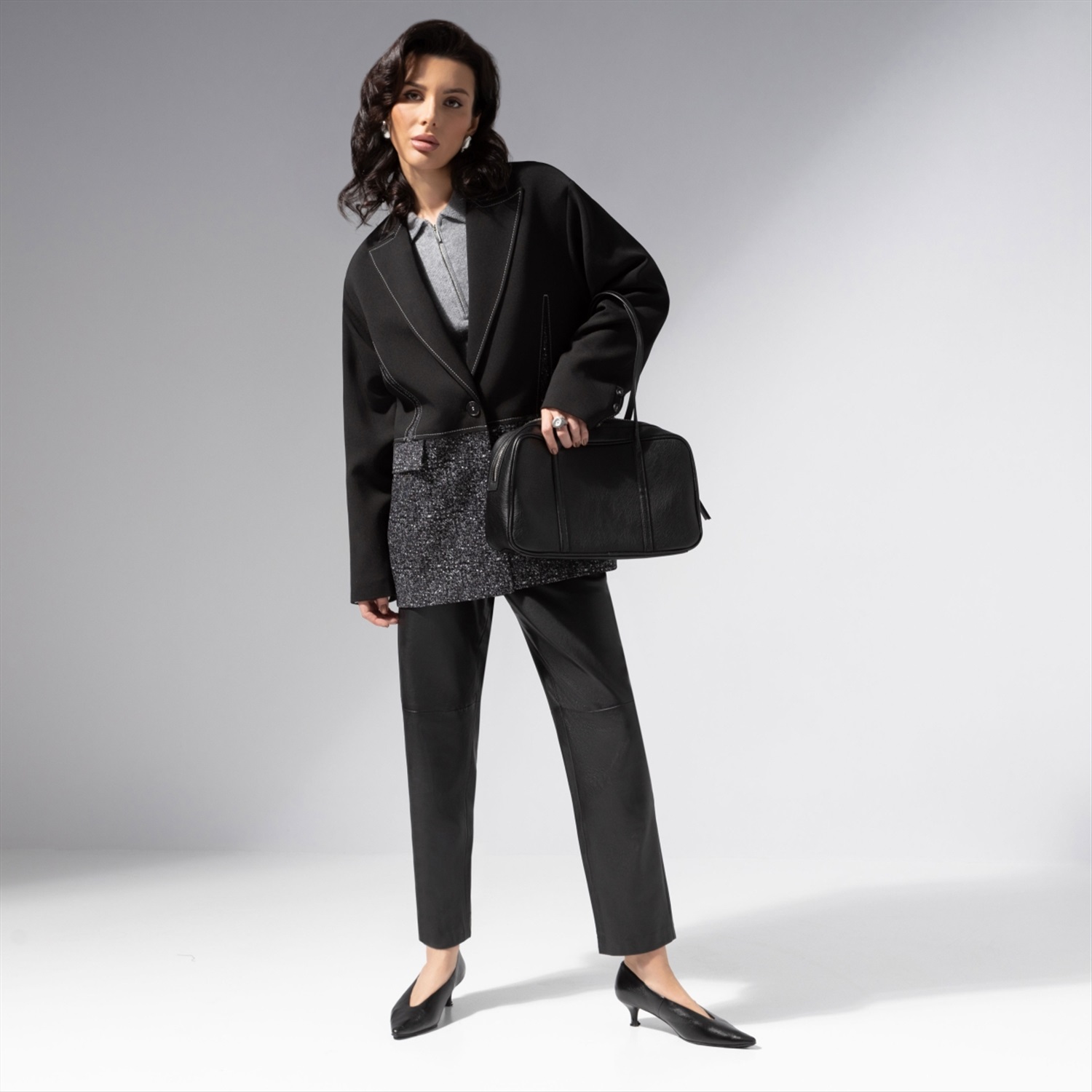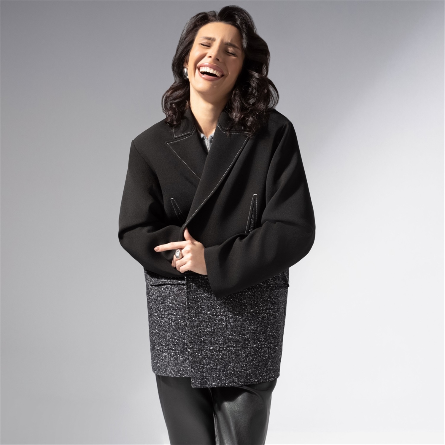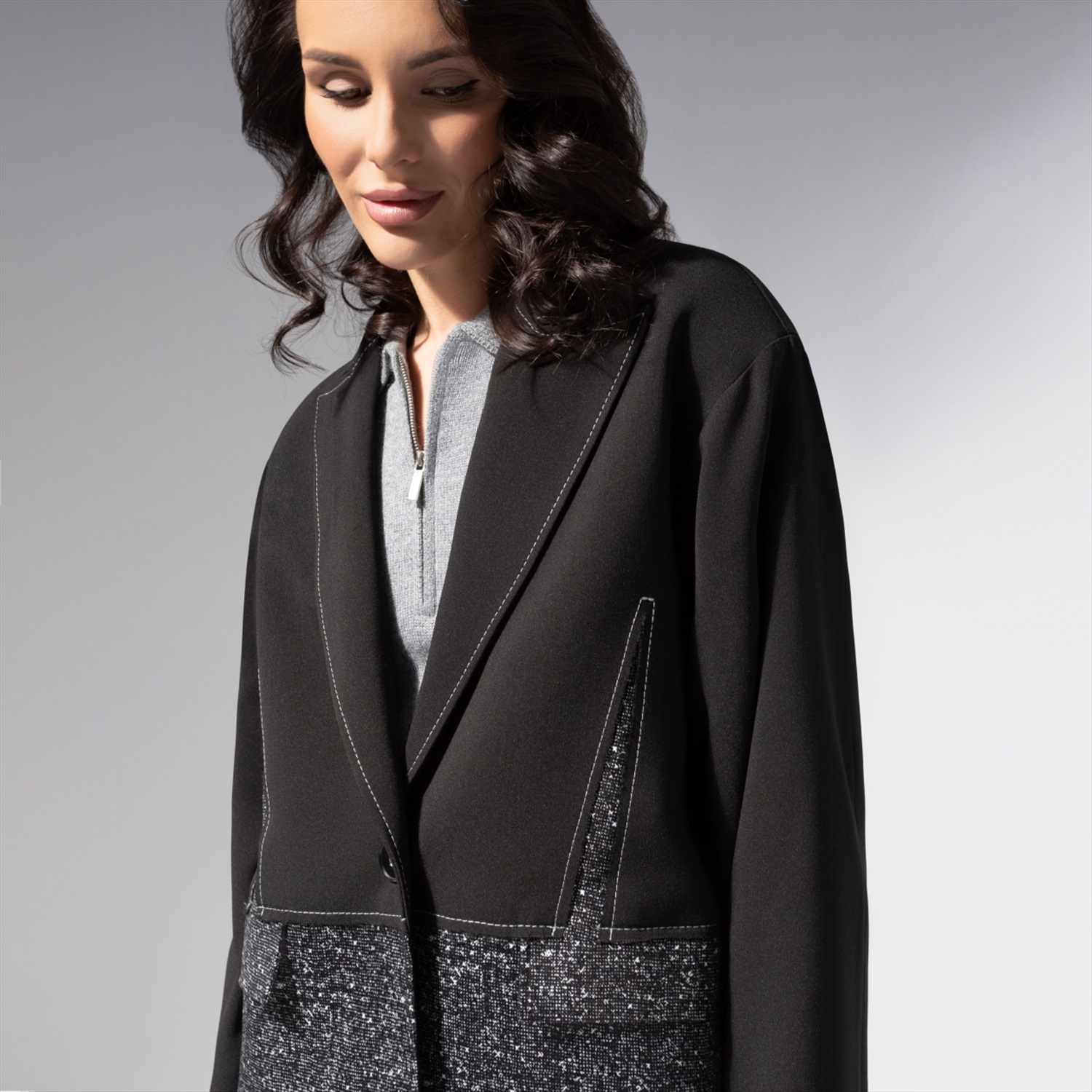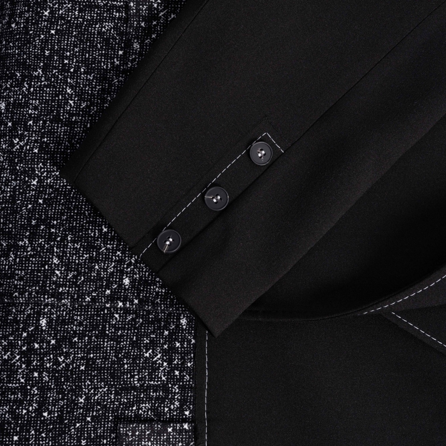 Состав: Костюмная ткань «пикачо», костюм. флак, «плат кагзи» (65% п/э, 30% вискоза, 5% спандекс) Плотность ткани: Плотная Тип ткани: Текстиль Вид застежки: Пуговица/-ы Декоративные элементы: Необработанные швы Дополнительный цвет ткани: Белый Карманы: Подрезные Основной цвет ткани: Черный Отрезная талия: Нет Подклад: Есть Резинка по талии: Нет Рисунок/раппорт: Нет, все изделия идентичны Сезон: Круглогодичный Силуэт: Свободный Этот жакет – как шахматная королева: спокойный, но стратегически точный. Дизайнеры ЧАРУТТИ сделали ставку на контраст гладкости и шероховатости, превратив классику в арт-объект. Для тех, кто видит силу в деталях. Модель свободного кроя с геометричными линиями и контрастной нижней вставкой. Сочетание трёх тканей: «пикачо», флак и «плат кагзи». Одинарная застёжка, английский воротник, декоративные швы. Жакет свободной посадки на подкладе с подплечниками. Комментарии к товару