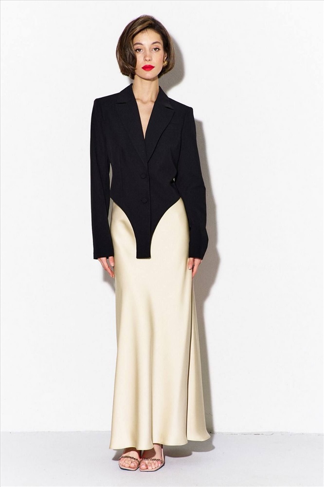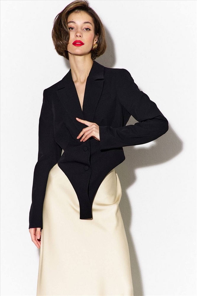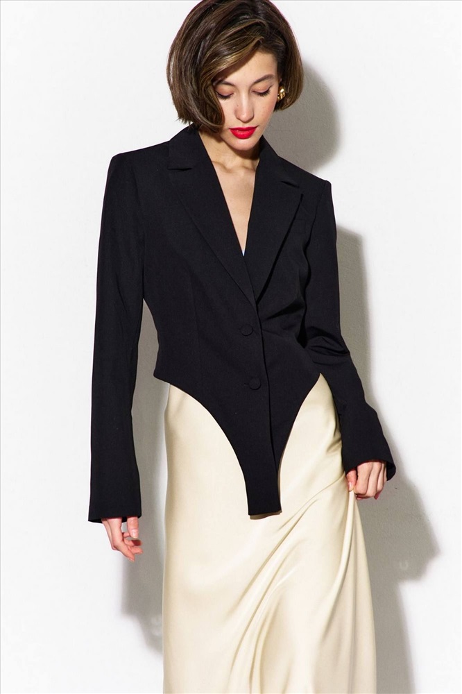 Жакет полуприлегающего силуэта: -фигурная линия низа с имитирующей боди -рукава длинные, двушовные, втачные -воротник пиджачного типа с лацканами -застёжка по переду на петли и пуговицы -жакет на подкладке, с плечевыми накладками.