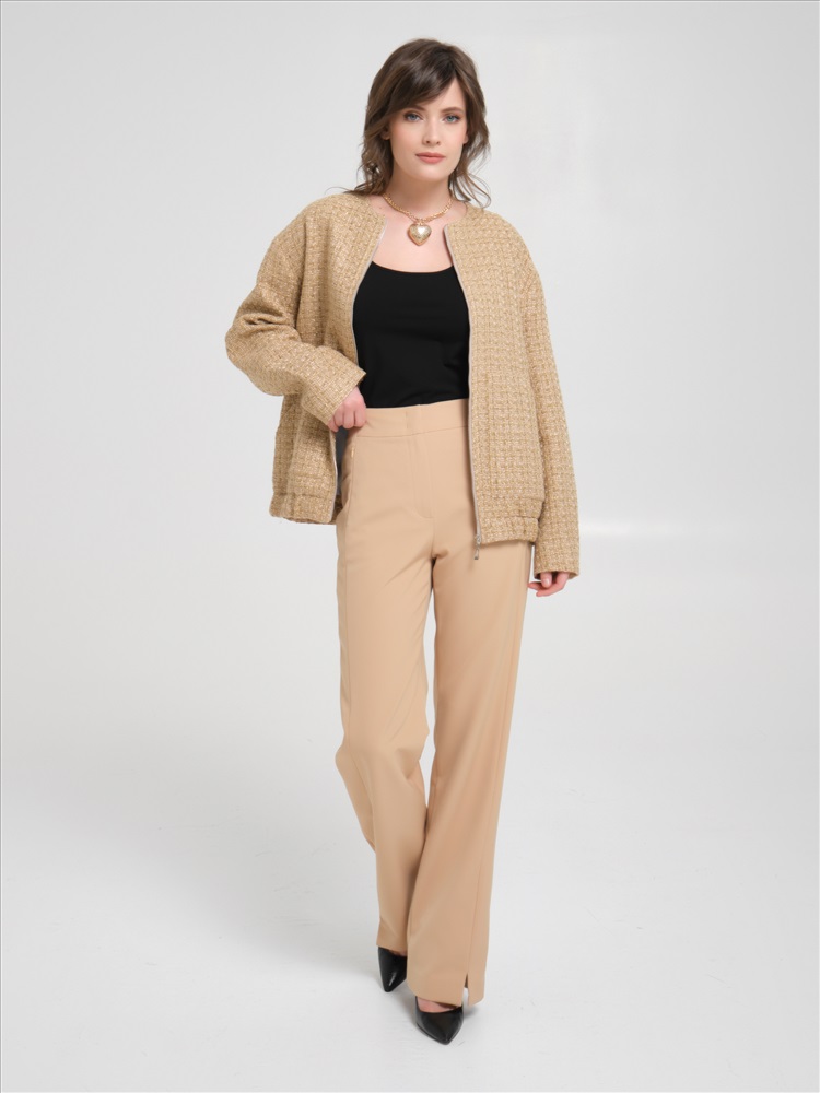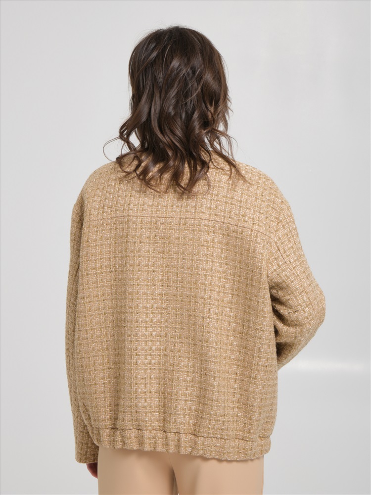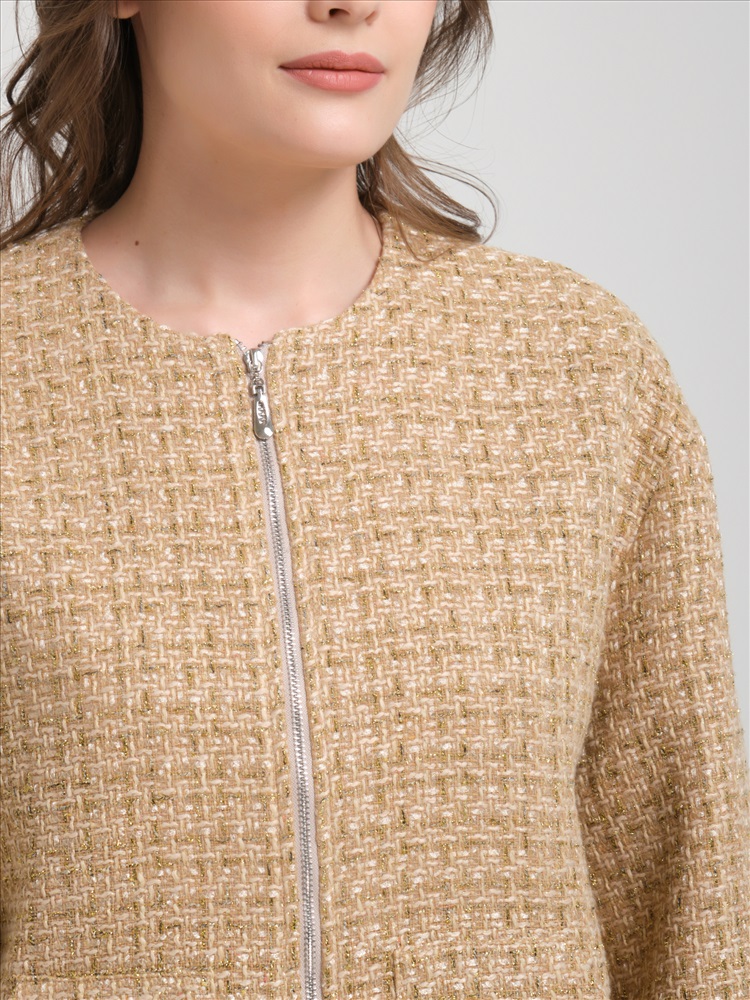 Жакет с люрексом на молнии от фабрики PRIZ. Модель прямого силуэта, выполнена из текстильного полотна медового оттенка, со спущенным плечом, на подкладе. Спереди фигурные накладные карманы. Спинка с кокеткой. Низ жакета обработан притачным поясом с резиной. Практичный вариант для создания повседневного гардероба., Оттенок цвета может незначительно отличаться от фото., Ожидание отправки (рабочих дней): 7, Длина: в 42 р-ре - 60,5 см, в 52 р-ре - 63 см., Размер модели: 44., Рост модели: 174 см., Состав:, Полиэстер 35%, Акрил 32%, Шерсть 30%, Мет.нить 3%, Тип ткани:, Текстиль