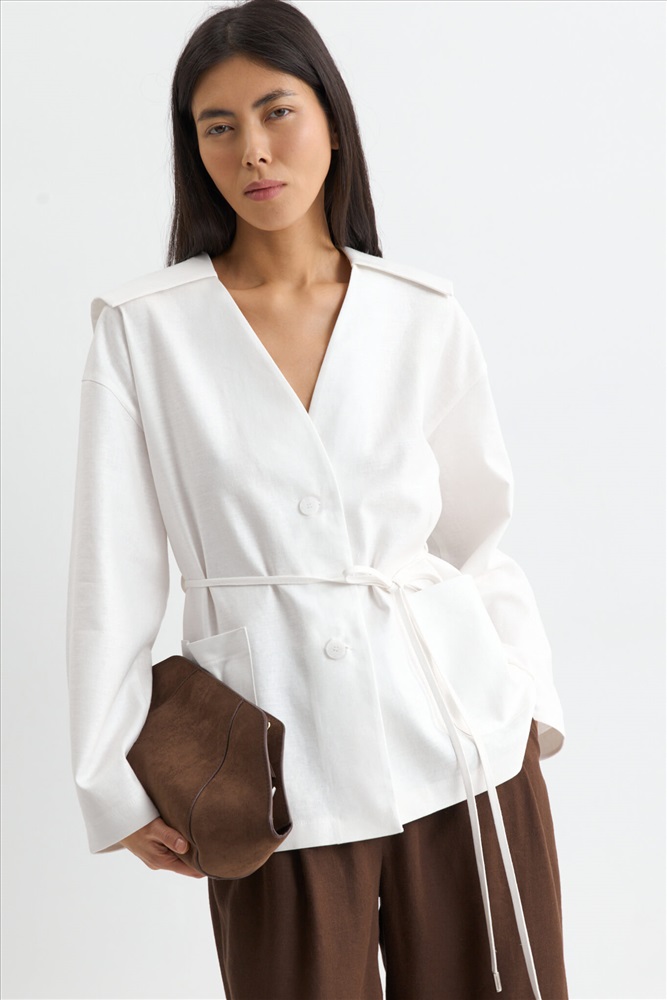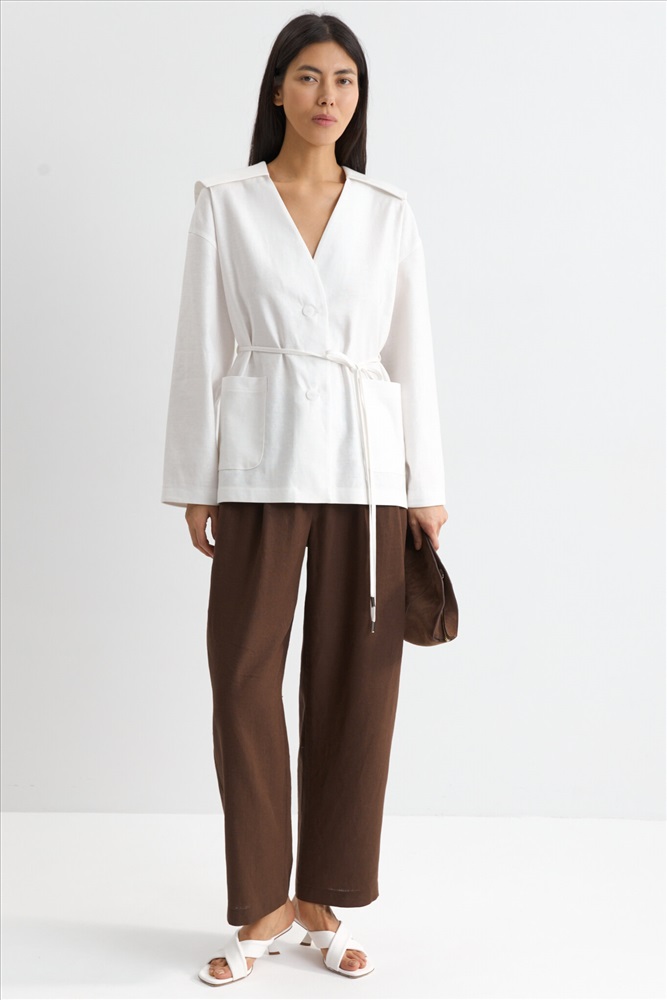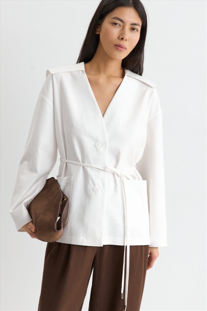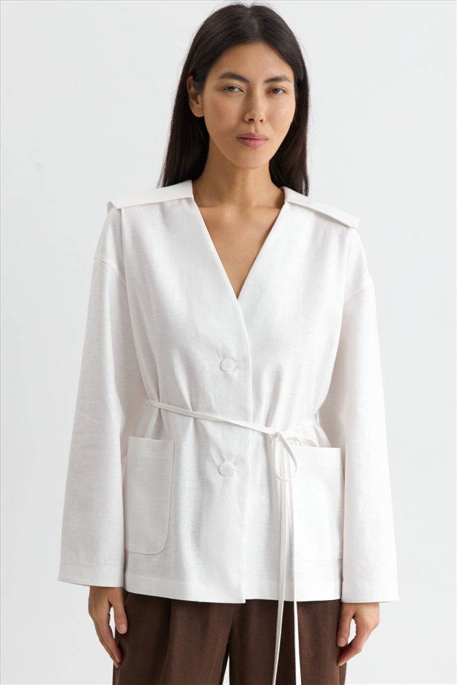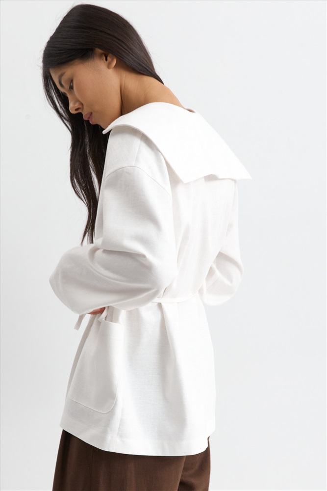 Состав: 70% Лен 30% Вискоза Цветовая гамма: Молочный Силуэт: Свободный Принт: Нет Коллекция: Лето #3 Жакет с акцентным воротником из льняного полотна. Модель свободного силуэта. Акцентный отложной воротник. Спущенная линия плеча. По переду накладные карманы, застежка на пуговицы. В комплекте тонкий пояс из основного материала. Комментарии к товару