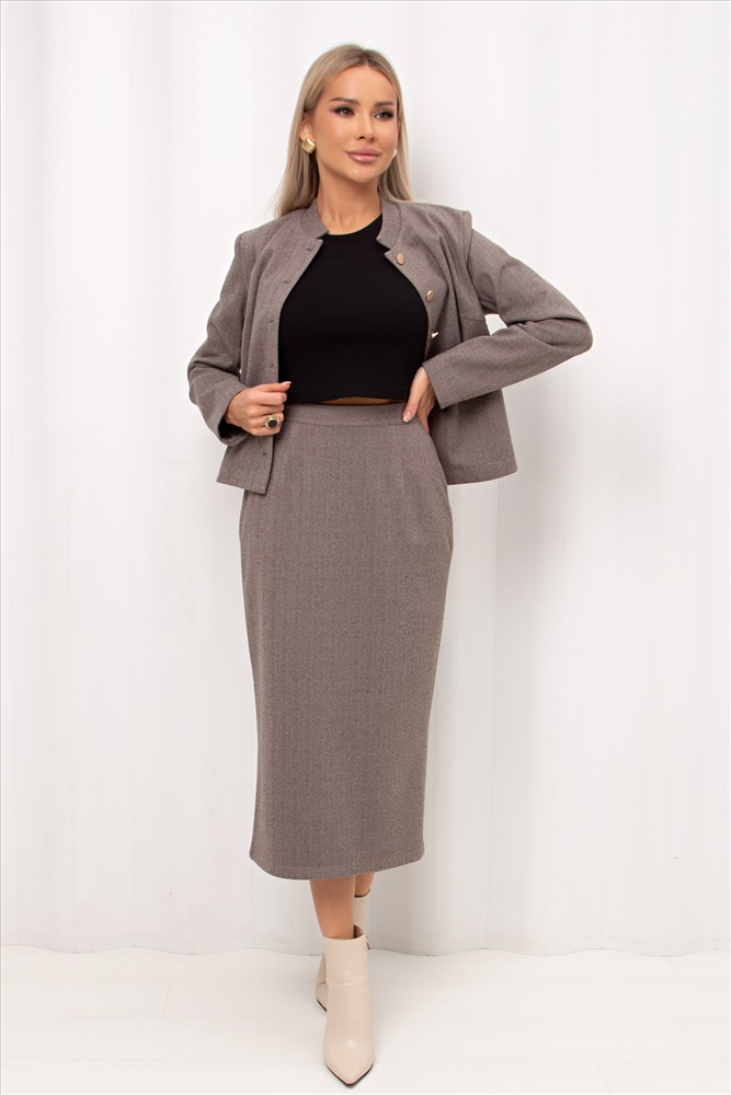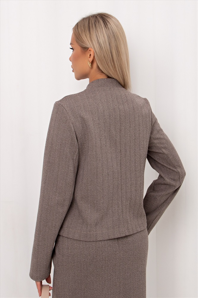 Жакет укороченный с длинными рукавами от компании Valentina. Модель прямого кроя из утепленного костюмного трикотажа в «ёлочку». Длинный втачной рукав. Горловина оформлена воротником-стойка. По центру переда застежка на петли и пуговицы. Жакет станет прекрасным дополнением к повседневному гардеробу. Рекомендуемая стирка при t не более 30°., Оттенок цвета может незначительно отличаться от фото., Ожидание отправки (рабочих дней): 8, Длина: 53 см., Размер модели: 42., Рост модели: 168 см., Состав:, Вискоза 65%, Полиэстер 30%, Эластан 5%, Тип ткани:, Трикотаж