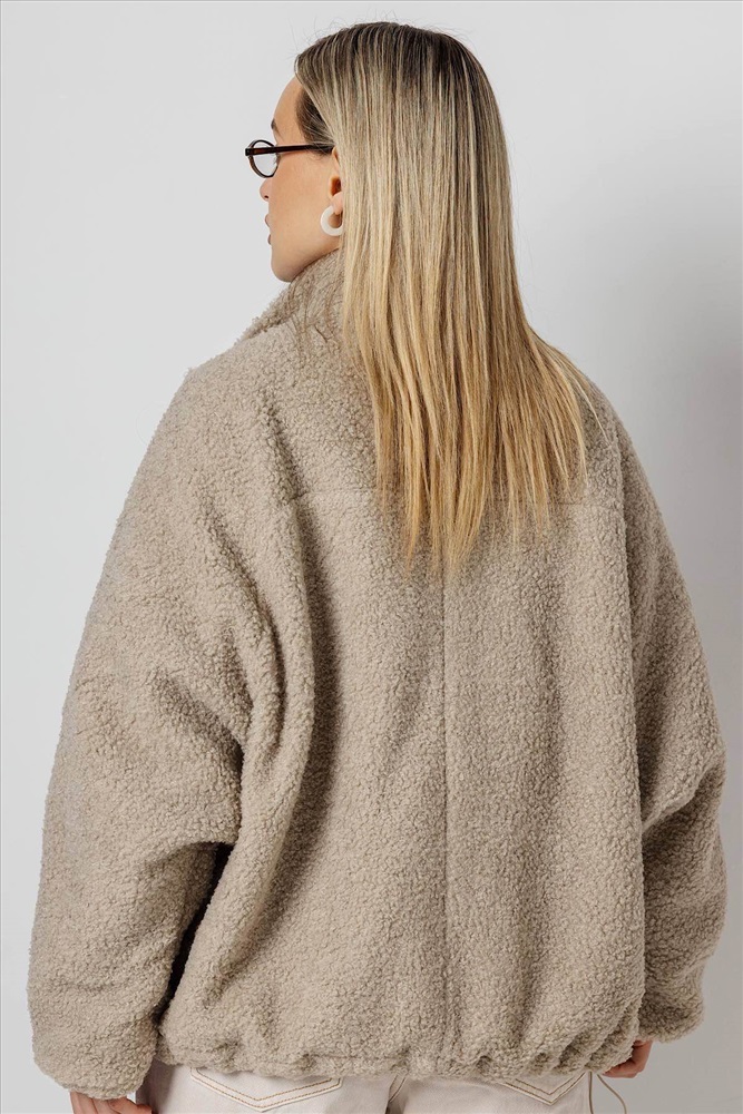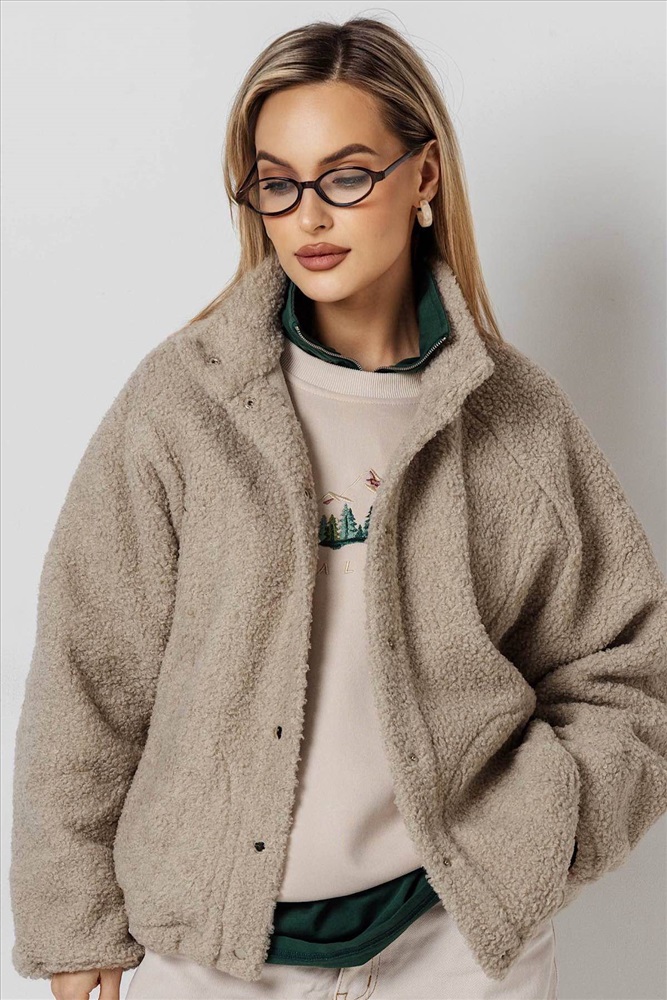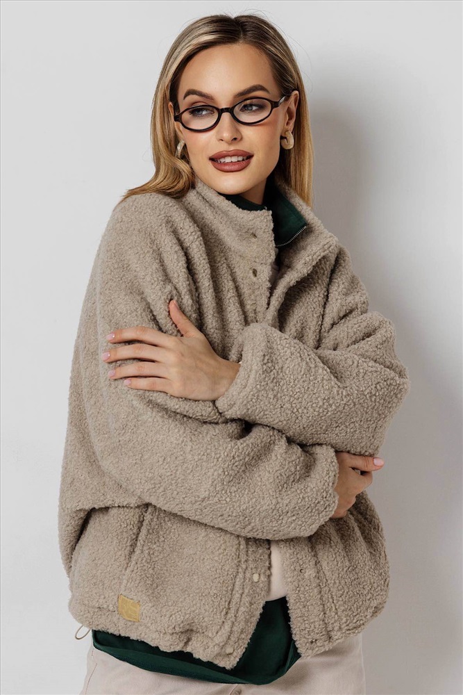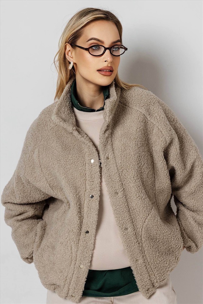 Трикотажный жакет без подклада, свободного силуэта в стиле бомбер с воротникомстойкой и втачным рукавом полной длины на на резинке с фиксатором — это универсальный предмет гардероба, который подойдет для повседневного образа. Застежка кнопки. Жакет будет подойдет для офиса, школы, повседневного образа. Накладные карманы