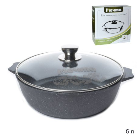 Крышка Жаропрочное стекло, с ручкой из нержавеющей стали, Материал корпуса Литой алюминий, Покрытие: антипригарное покрытие, Объём 5 л.