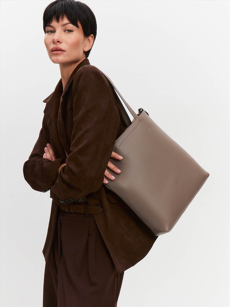 Габариты: 32x30x9 32 см x 30 см х 9 см Вместительная сумка-тоут из 100% мягкой кожи от Richet, закрывается на кнопку, носится на плече или в руке. Этот презентабельный аксессуар выполнен из кожи на подкладке из бархатистой микрофибры. Эту сумочку выбирают женщины, предпочитающие качество не только товаров, но и материалов. Конечно, такая сумка на плечо стоит дороже, чем текстильный шопер. Но его стоимость оправдана. Натуральная кожа придает сумке женской для офиса особый шик и шарм. Внутри: нашивной вместительный карман на молнии. Дополнительно: ремень на карабинах - длина 100см Комментарии к товару