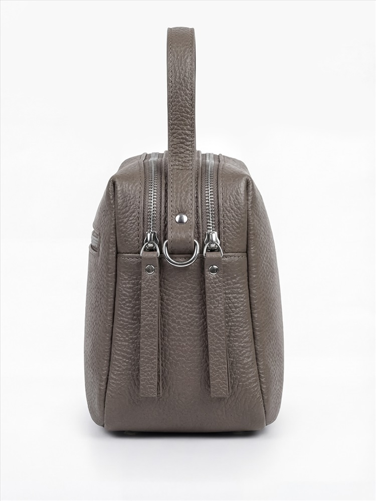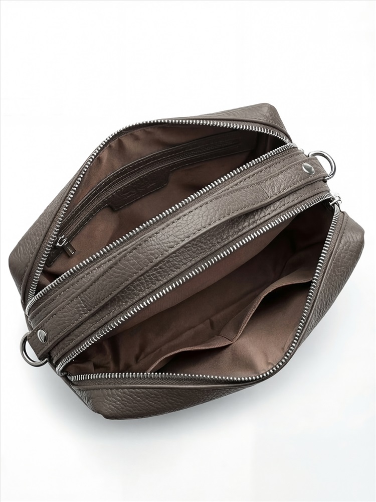 Материал: натуральная кожа Габариты: 20x25x11 20 см x 25 см x 11 cm Элегантная сумочка, носится в руке и на плече на длинном ремне. Максимальная длина регулируемого ремня с карабинами 125 см Высота ручки 12 см. В сумочке два отделения, каждое из которых закрывается на молнию. Внутри сумочки карман для документов на молнии, два открытых кармана для мелочей и/или телефона и карманчик для авторучки. На задней стенке расположен вместительный карман на молнии. Комментарии к товару