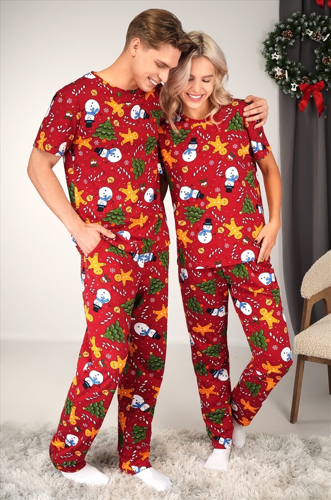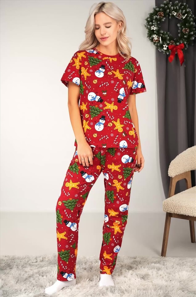 Женская новогодняя пижама с брюками выполнена из натурального 100% хлопка. Яркий красный цвет и праздничный принт создают атмосферу праздника и поднимают настроение, а мягкий трикотаж дарит комфорт. Домашний комплект двойка для женщин станет чудесным подарком на Новый год или Рождество.