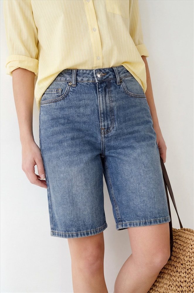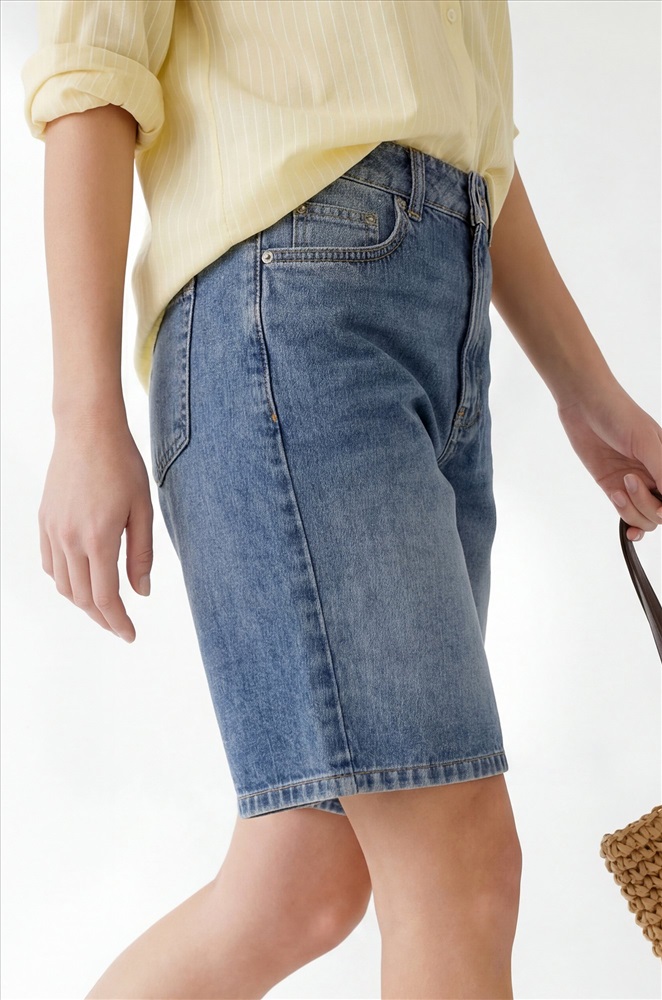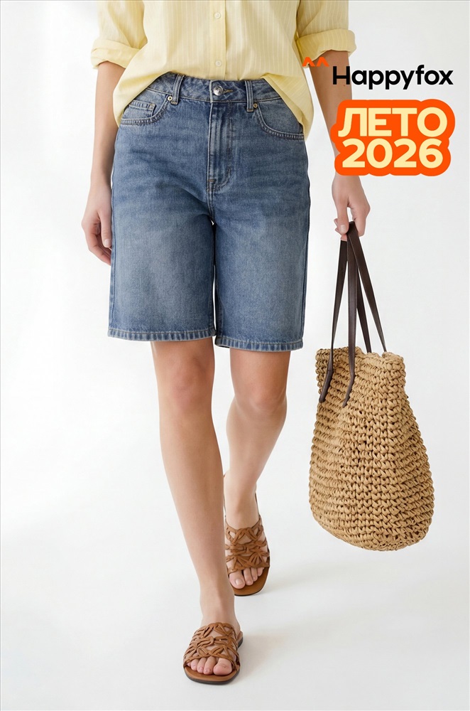 Женские джинсовые шорты бермуды — стильная и универсальная модель для летнего гардероба. Удлинённые шорты с высокой посадкой подчёркивают талию и создают актуальный силуэт. Синие шорты в стиле у2к идеально вписываются в кэжуал образы.