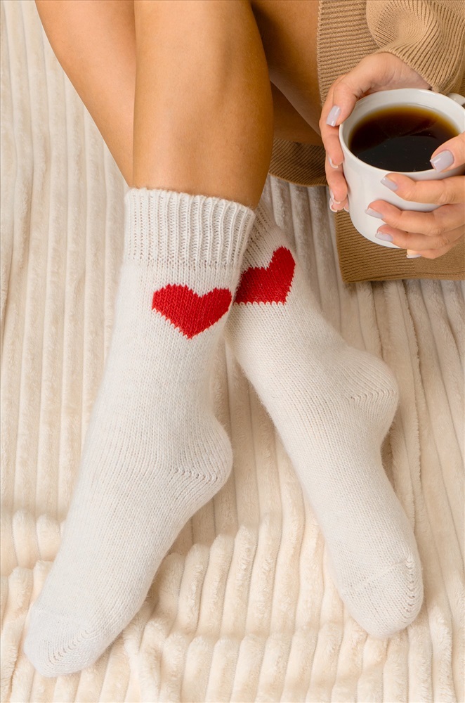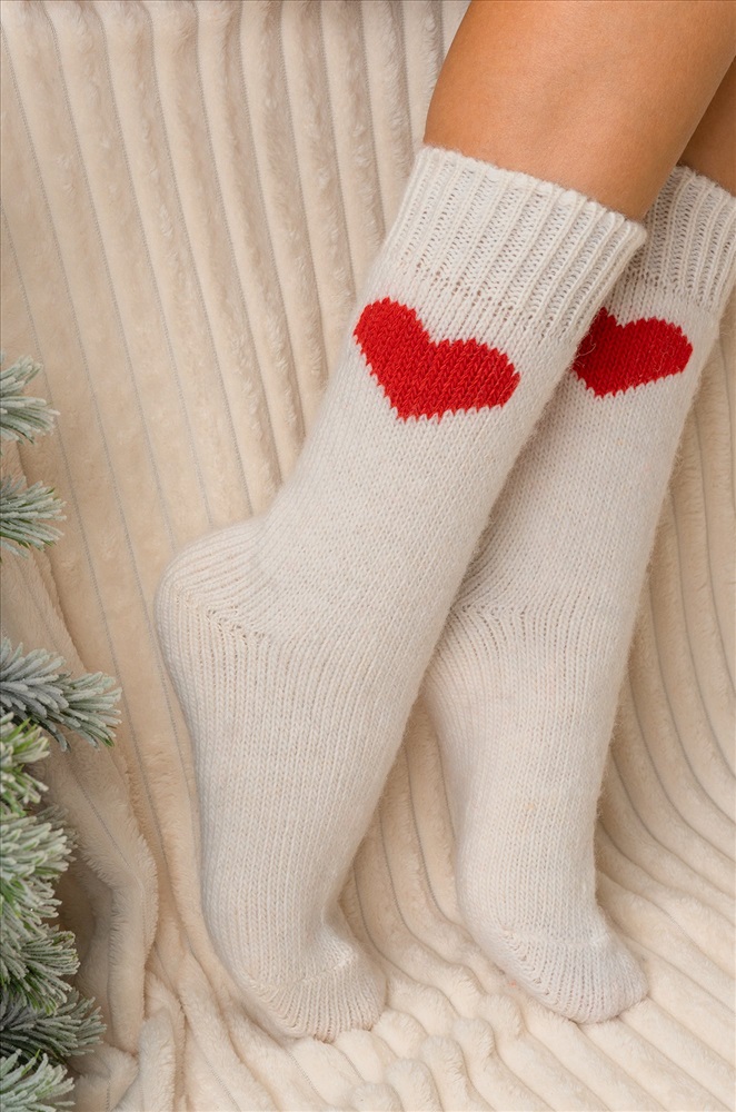Теплые шерстяные носки для женщин выполнены из приятной к телу пряжи с высоким содержанием натуральной шерсти. Белые носки с ярким рисунком Сердце принесут не только тепло, но и радость в холодные дни. Вязаные носки подарят обладательнице исключительную мягкость и комфорт. Натуральная шерсть отлично сохраняет тепло и позволяет коже дышать, а акрил и полиамид добавляют прочности и эластичности. Высокие женские носки с широкой мягкой резинкой отлично держатся на ноге, мягко облегают, не передавливая в щиколотке. Красивые носочки универсального размера станут отличным дополнением к зимнему образу. Длинные носки из шерсти подойдут для женщин, которые ценят тепло и уют в зимний период, они идеальны для повседневного использования, а также для подарка на Новый год или Рождество. Комментарии к товару