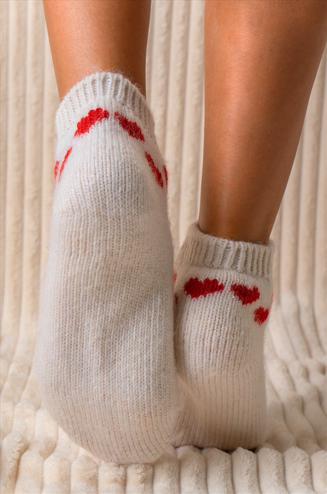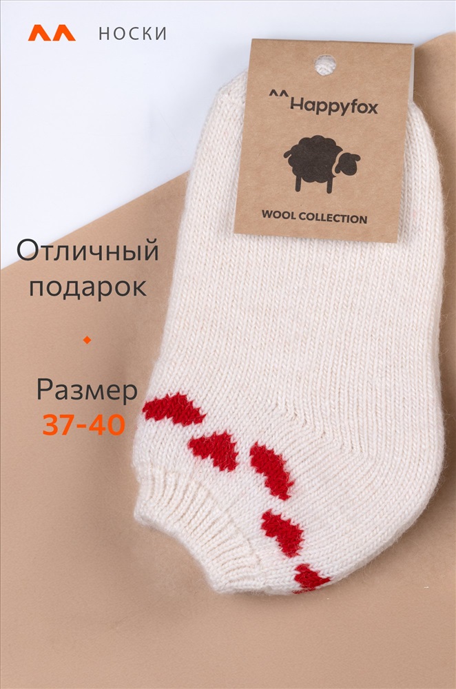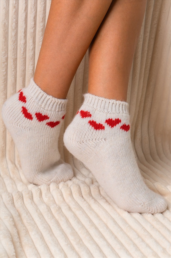 Теплые женские носки выполнены с высоким содержанием натуральной шерсти. Короткие носки представлены в белом цвете и украшены узором Сердечки. Вязаные шерстяные носочки идеальны для уютных домашних вечеров в кругу семьи. Пряжа из овечьей шерсти делает носки теплыми и идеальными для морозной зимы. Благодаря полиамиду и акрилу в составе они сохраняют форму даже после частых стирок. Носочки с рисунком нежно облегают ноги и не сползают при активных движениях благодаря плотной вязке. Эластичная резинка не сдавливает кожу и не ощущается на теле. Красивый узорный орнамент создает атмосферу уюта и счастья. Зимние носки подходят под коньки и лыжные ботинки. Утепленные следки оценят те, кто любит проводить время на свежем воздухе. Укороченные носки универсального размера подойдут женщинам и девочкам-подросткам. Шерстяные следочки с рисунком станут приятным дополнением к подарку на Новый год или Рождество, а также подойдут для праздничной фотосессии. Комментарии к товару