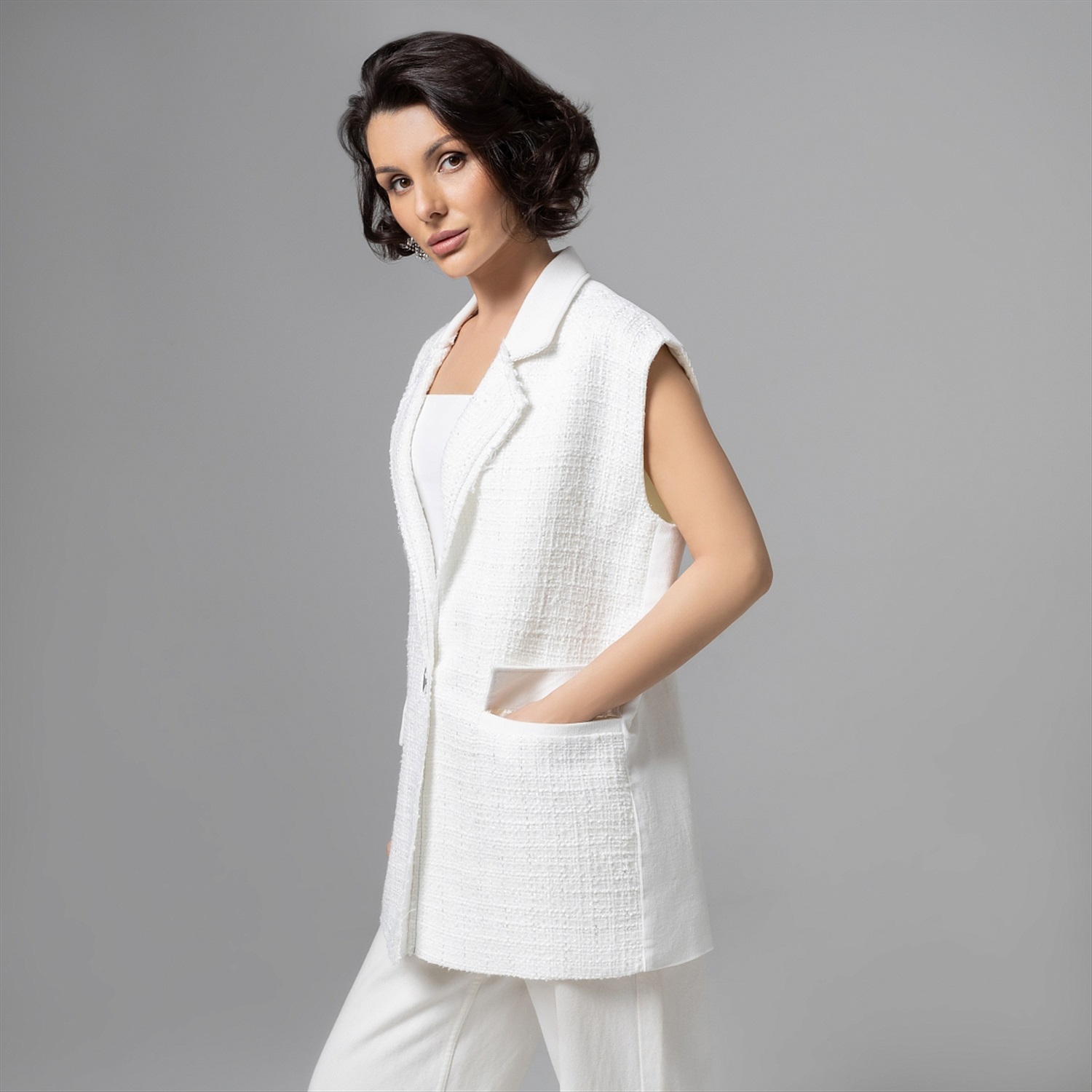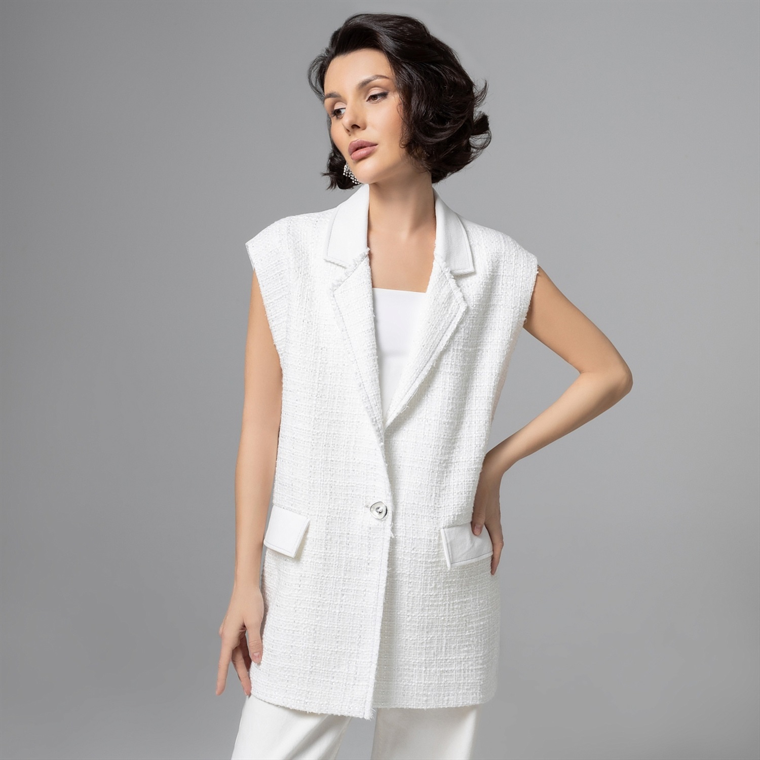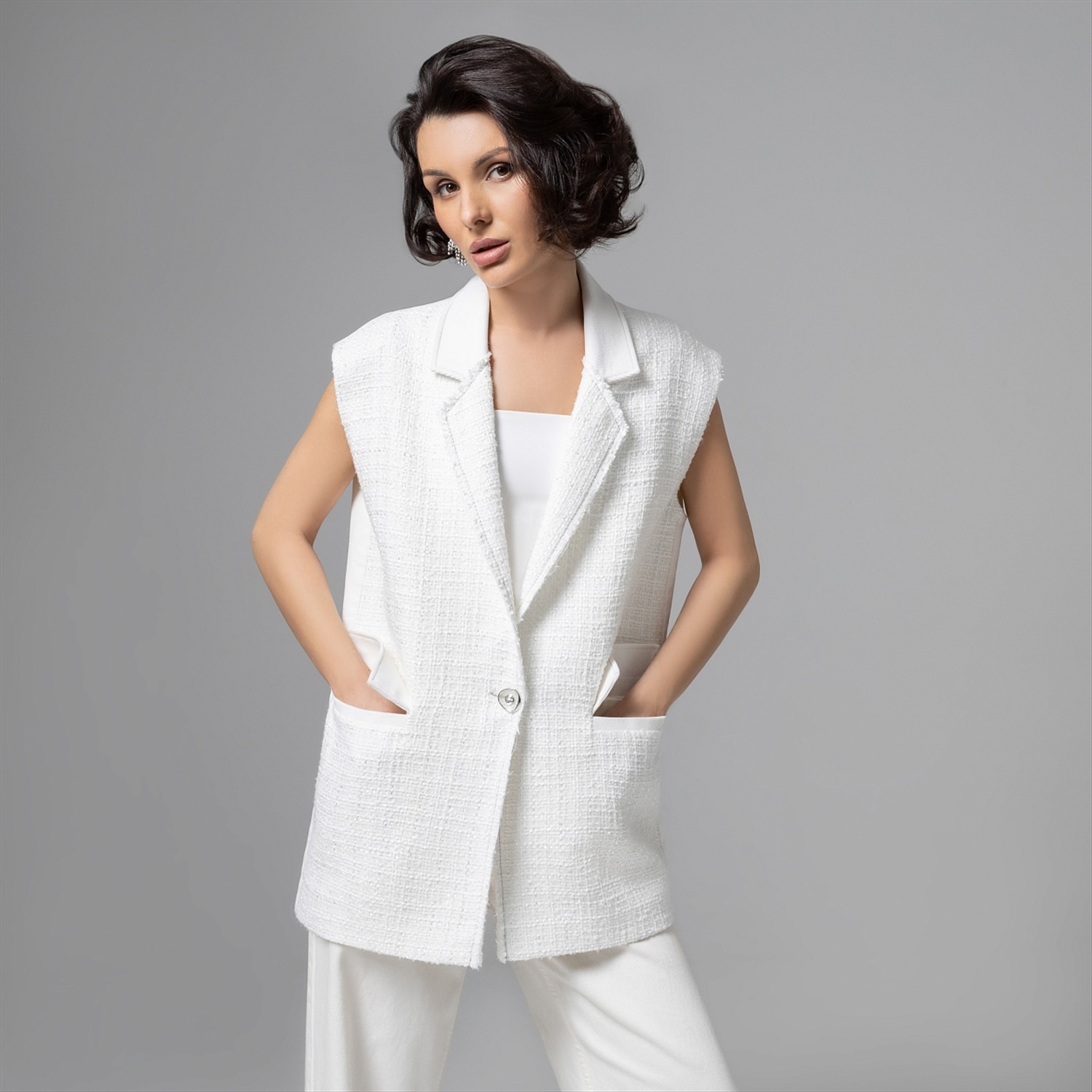 Стремишься выглядеть так, будто в планах не просто новая должность, а собственный этаж в бизнес‑центре? Удача любит амбициозных. Античный белый букле в стиле Chanel создает ощущение света вокруг твоей фигуры, четкие лацканы и вытянутый силуэт работают как визуальный лифт – от первого совещания до ночного рейса в другой город. Надевая жилет поверх топа в тон, ты как будто нажимаешь кнопку «вверх» – по статусу, влиянию и внутренней свободе. Костюмное букле шанель мягкое, объемное и держит форму, за счет фактурного переплетения выглядит по‑кутюрному благородно. Изделие с карманами, на подкладе. Комментарии к товару
