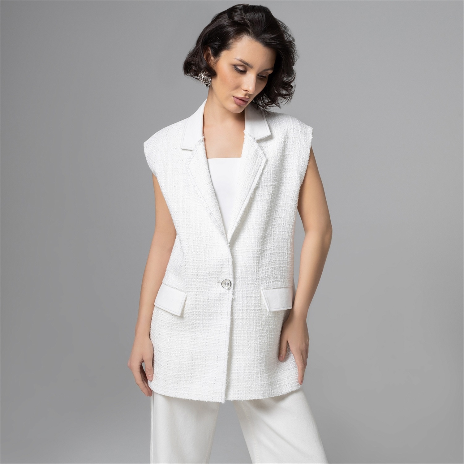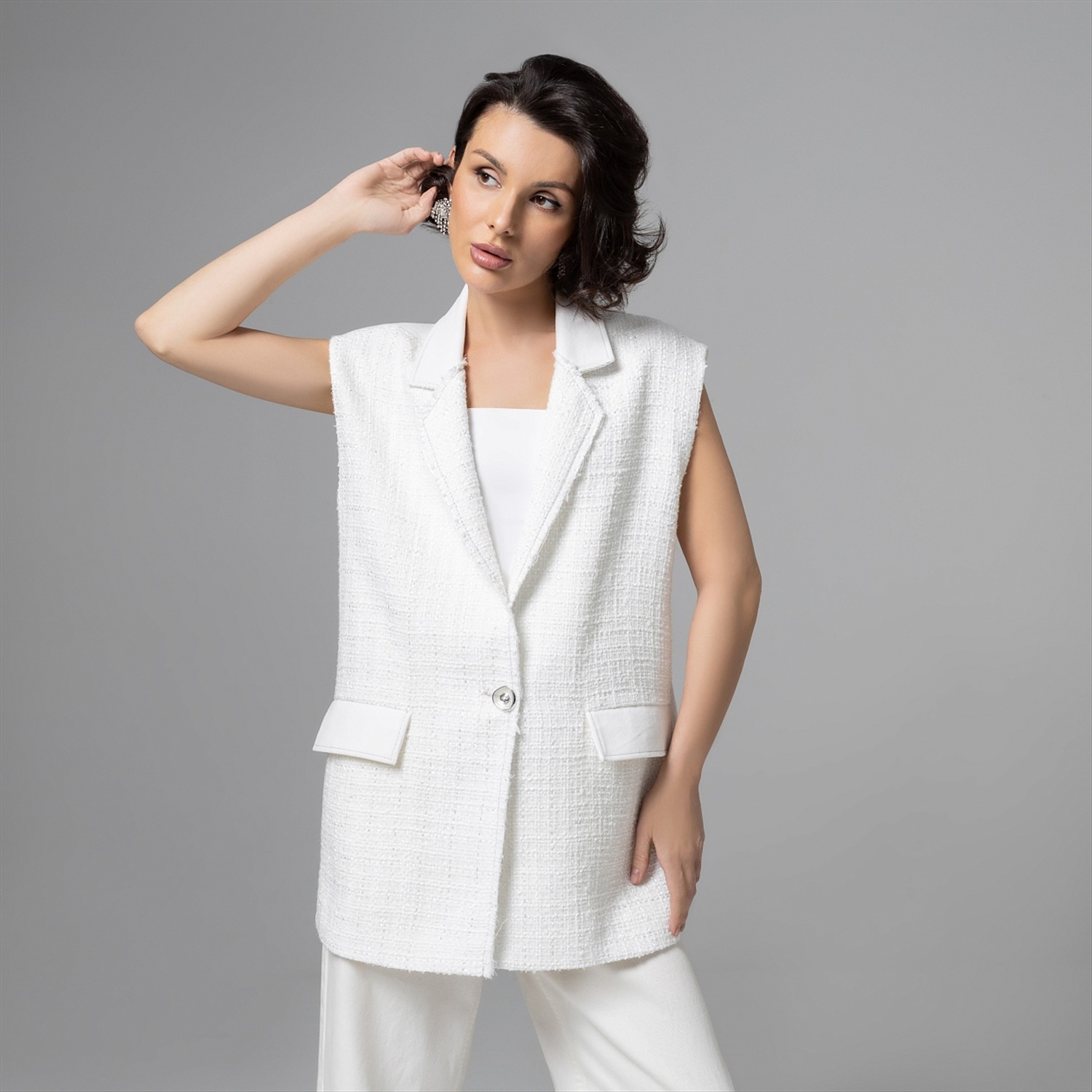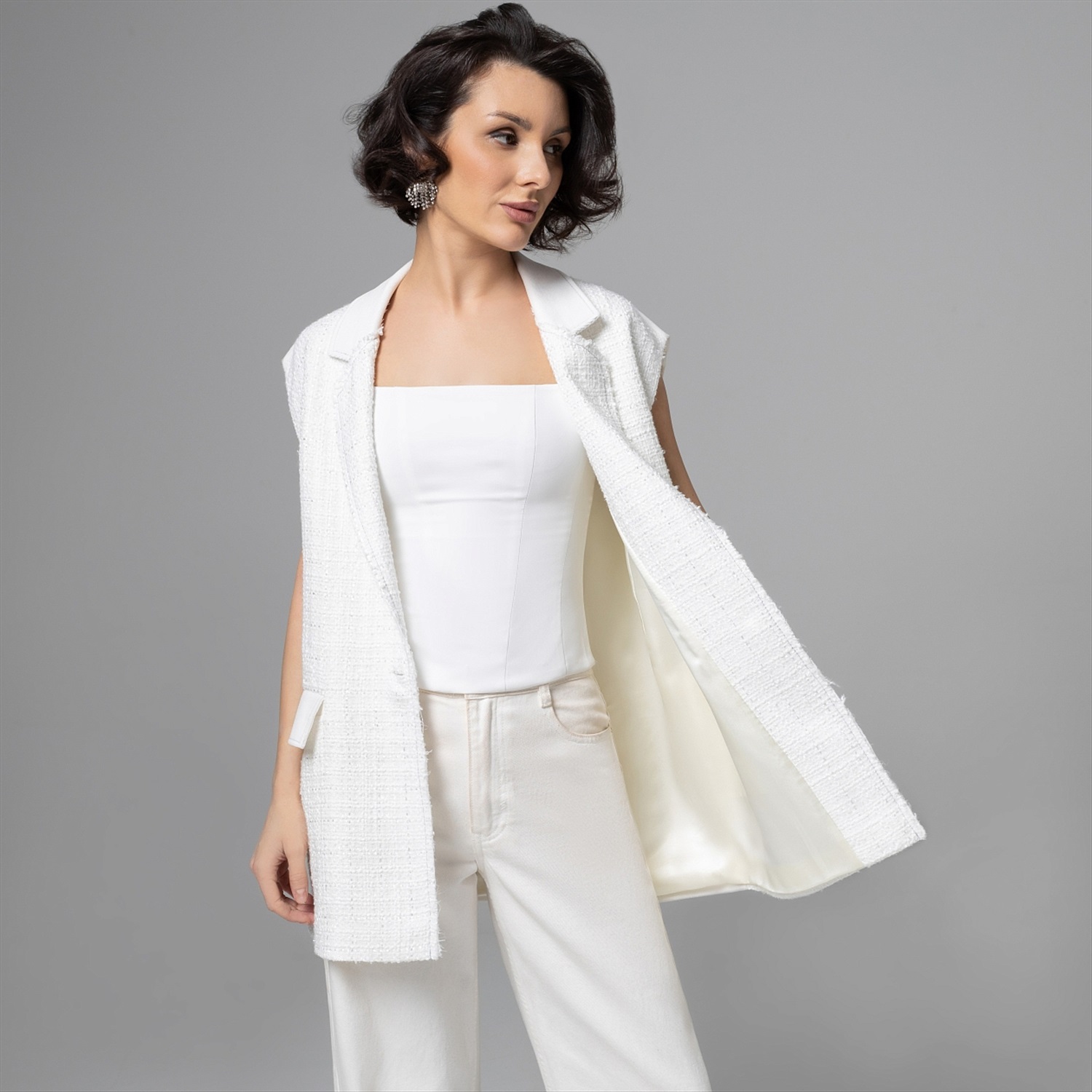 Стремишься выглядеть так, будто в планах не просто новая должность, а собственный этаж в бизнес‑центре? Удача любит амбициозных. Античный белый букле в стиле Chanel создает ощущение света вокруг твоей фигуры, четкие лацканы и вытянутый силуэт работают как визуальный лифт – от первого совещания до ночного рейса в другой город. Надевая жилет поверх топа в тон, ты как будто нажимаешь кнопку «вверх» – по статусу, влиянию и внутренней свободе. Костюмное букле шанель мягкое, объемное и держит форму, за счет фактурного переплетения выглядит по‑кутюрному благородно. Изделие с карманами, на подкладе. Комментарии к товару